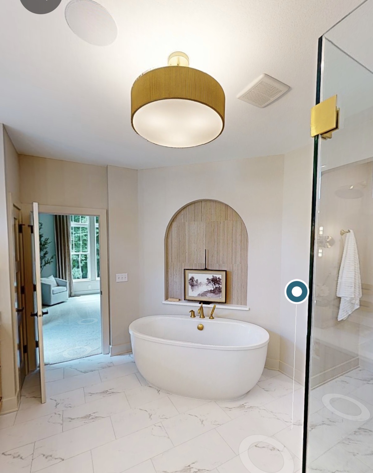 add a white door to the water closet toilet change to wide plank european white oak flooring change chandelier change the shower floor to white vinyl solid shower base change the cabinet color to iron ore paint color change only wall behind the tub only to light brown wood fluted tile remove the arch detail and tile the whole angled wall area only