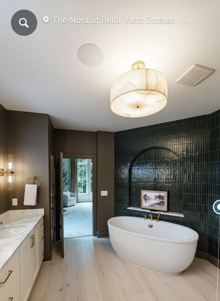change floors to european white oak flooring change the chandelier to round alabaster stone chandelier change the cabinets to dark charcoal color change the walls to a moody color close the door replace the tile wall behind the tub to the reference image and expand it inside and outside of the arch detail