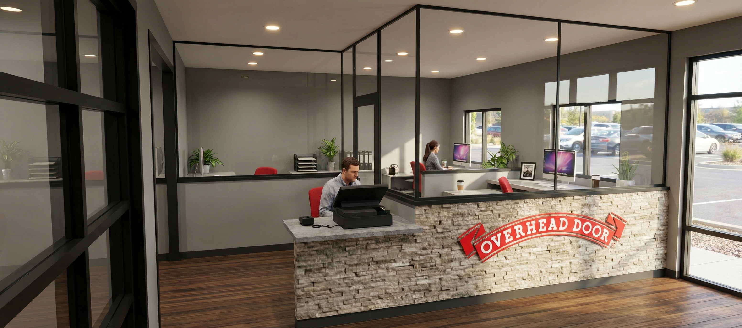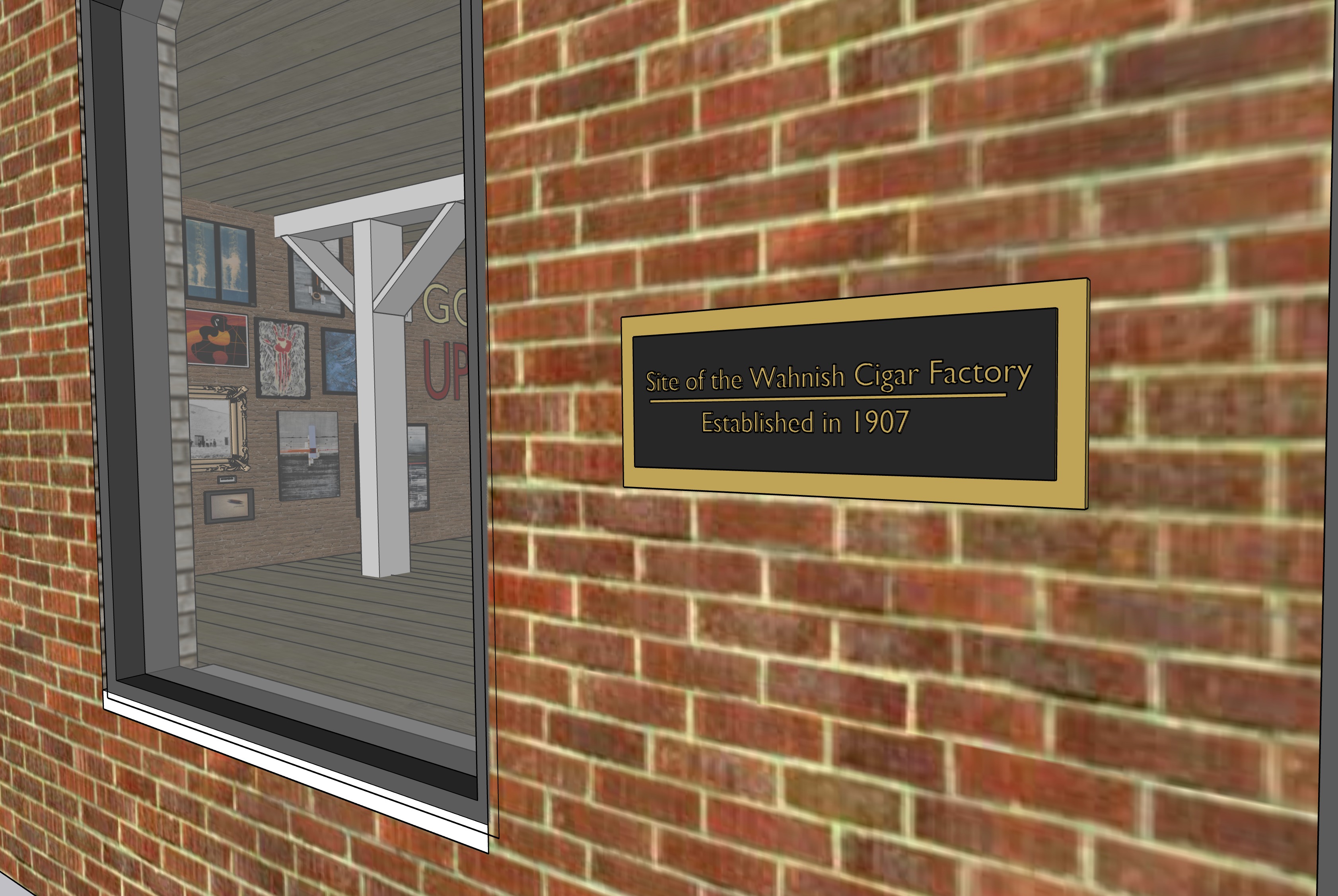 this scene is of a bronze plaque looking inside a building through the window the white beams and columns inside the window are rustic