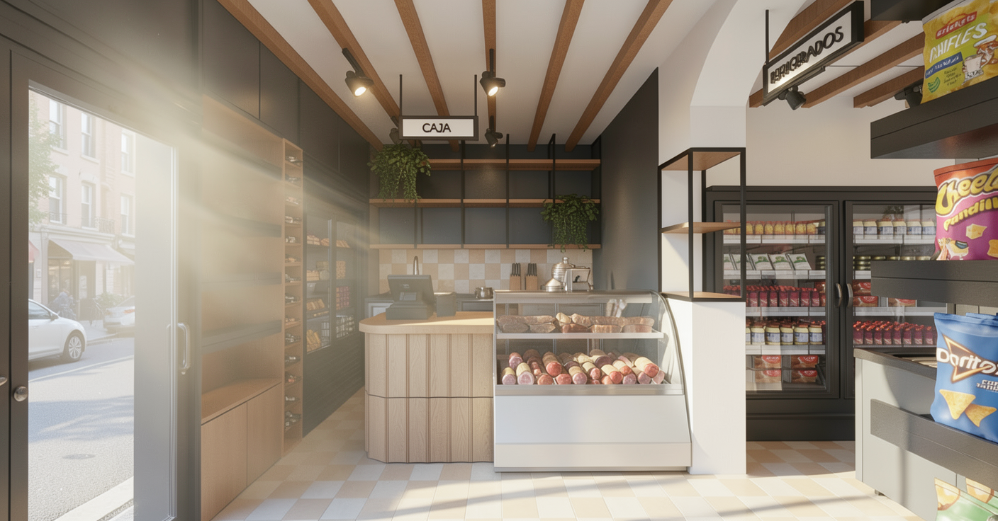 crea una imagen fotorealista a partir de esta de sketchup la unica luz natural que entra es de la puerta de la izquierda el resto en artificial