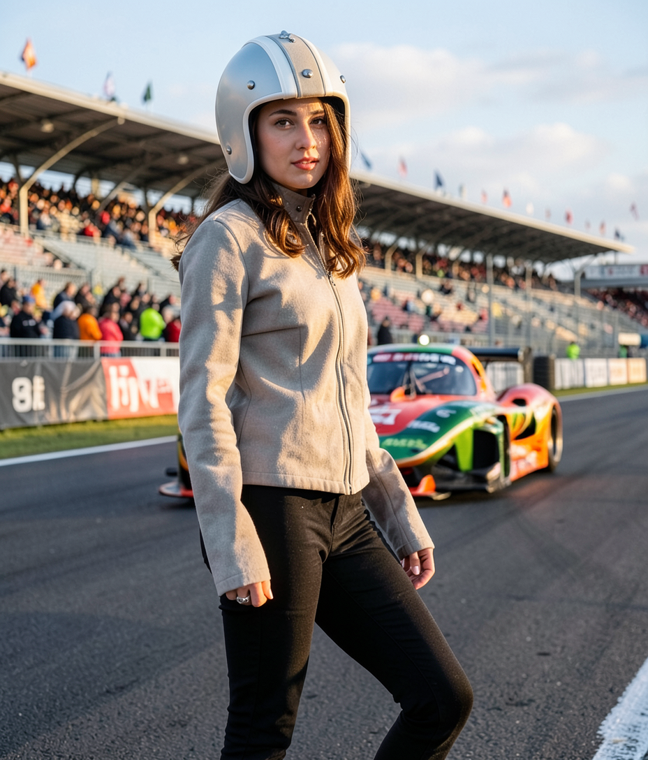put model in racing background do not change her face
