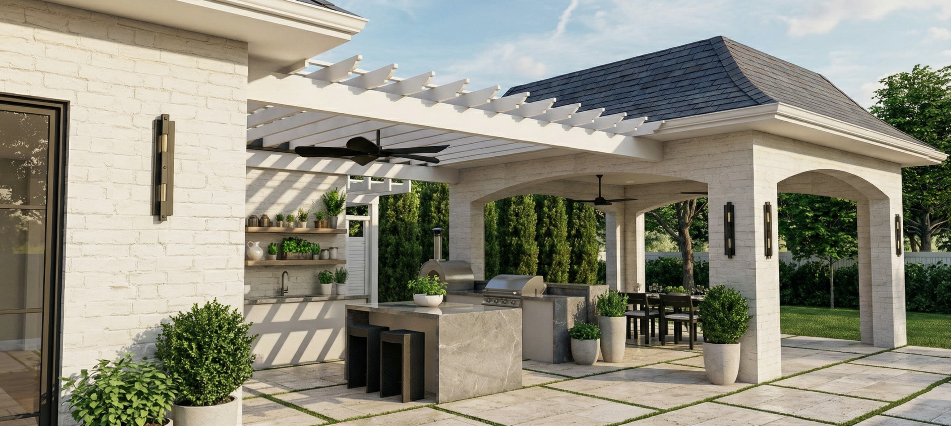 render a modern outdoor kitchen and dining area with a sleek minimalist style use a bright white brick texture for the walls and pillars complemented by a rich dark brown shingle roof incorporate a light gray marble texture for the countertops and island the ceiling fans should be matte black to add contrast use deep black for the stools and wall lights add a natural green background with lush vibrant trees for a serene and relaxing atmosphere ensure the pergola casts soft patterned shadows enhancing a warm inviting ambiance with a light blue sky overhead