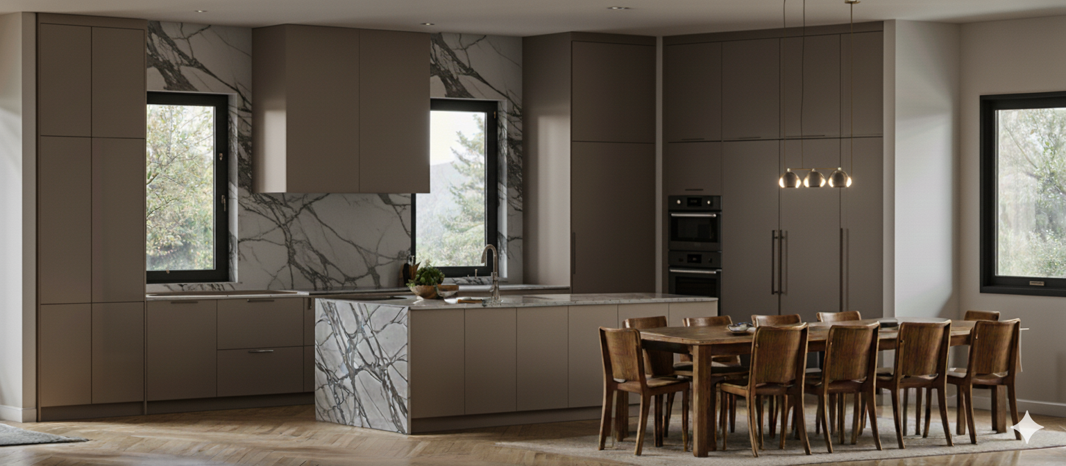 exterior shot modern kitchen interior featuring sleek taupe cabinets and a central island with elegant white marble and gray veining the countertops match the island enhancing the marble aesthetic large windows allow natural light to flood in creating a bright atmosphere wooden dining table and chairs in warm brown tones provide a cozy touch pendant lighting hangs above the table casting a soft ambient glow the overall ambiance is contemporary and inviting with natural elements and neutral hues fostering a calm sophisticated environment