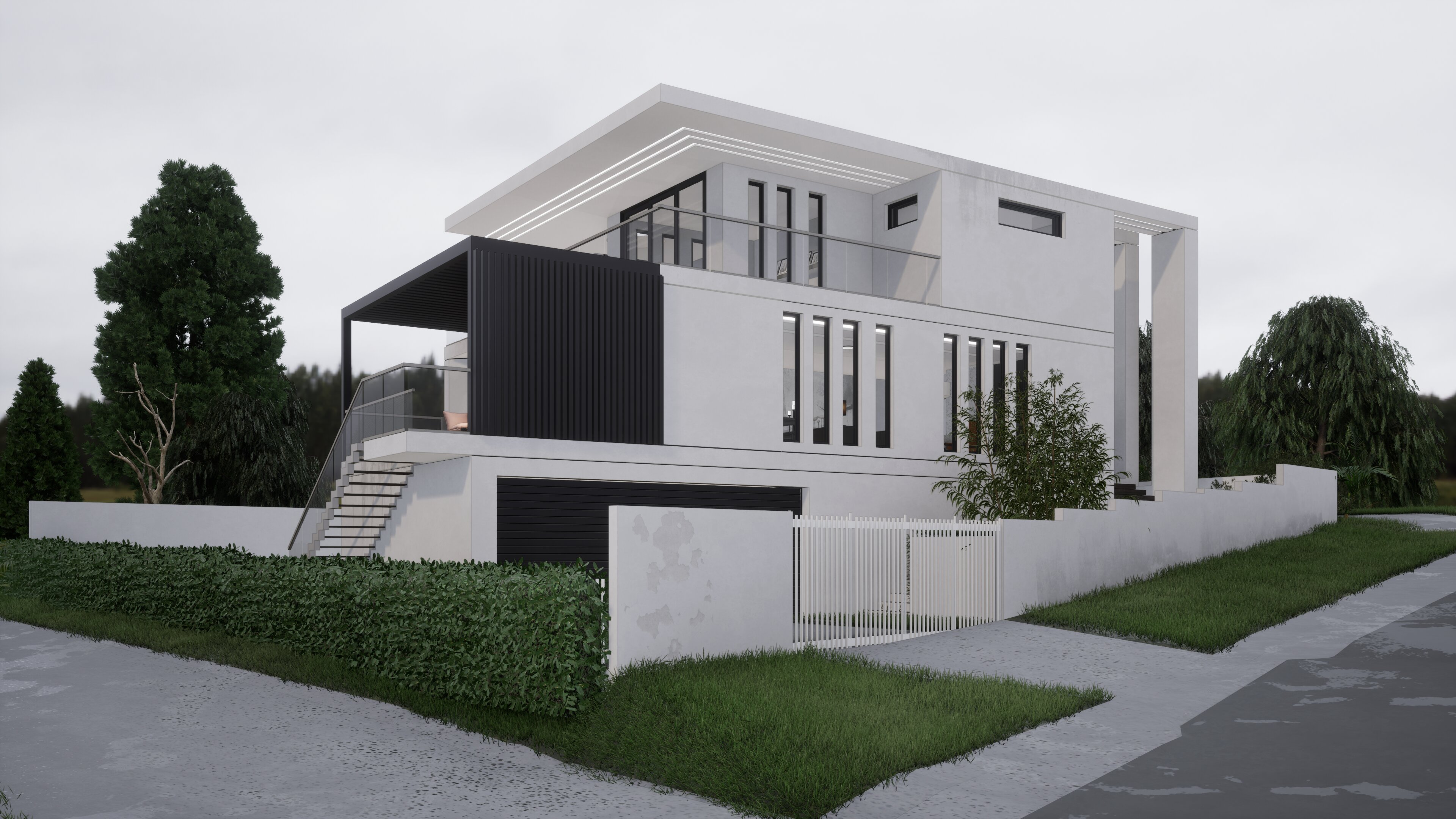 the two storey luxury home is surrounded by a lot of australian native trees bushes and flowers in the garden the external finishes are concrete with monument features