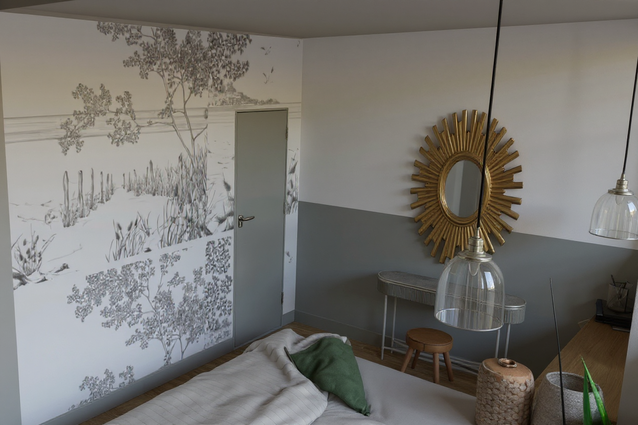 tapisserie blanche et grise soubassement gris froid miroir dor suspension en verre lumi re allum e r tro clairage