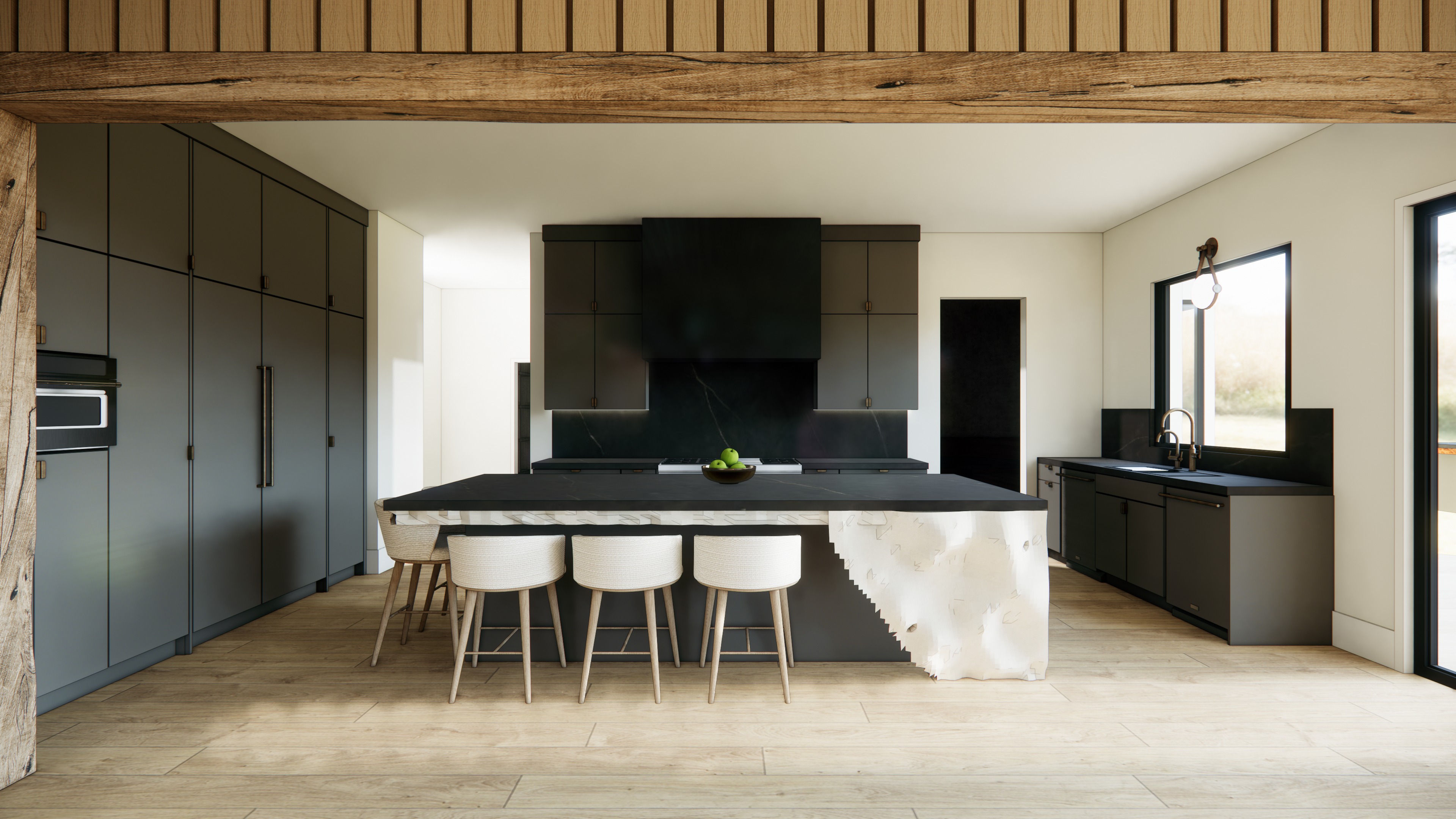 ultra photorealistic interior photograph of a modern mountain cabin kitchen maintain the exact architecture layout and finishes from the original render a contemporary kitchen with dark charcoal painted cabinet with slab doors antique brass faucets and an induction wolf range the range wall cabinets should have under cabinet lighting the space features warm neutral tones materials should appear highly realistic light oak wood plank floors porcelain stone look countertop with very minimal veining and soft boucle upholstery on the bar stools the island should feature a large boulder on the front underneath the countertop the rock formation should continue underneath the countertop along the front of the island and wrap around the left and right side lighting should feel natural and cinematic but daytime lighting shot as professional interior architecture photography with a full frame camera 24mm lens shallow but natural depth of field extremely high dynamic range crisp focus subtle lens imperfections and natural exposure style similar to high end architectural photography seen in a design magazine of luxury mountain homes in jackson hole or aspen ultra detailed photorealistic materials ray traced lighting global illumination cinematic composition natural color grading realistic textures professional interior photography do not change layout do not add furniture no redesign no extra windows no people no clutter no surreal lighting no warped geometry