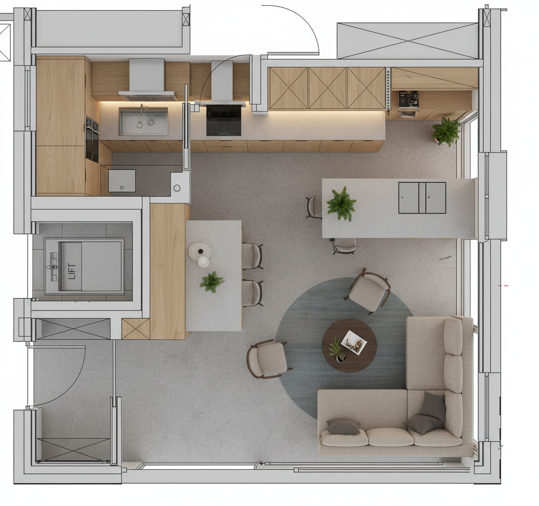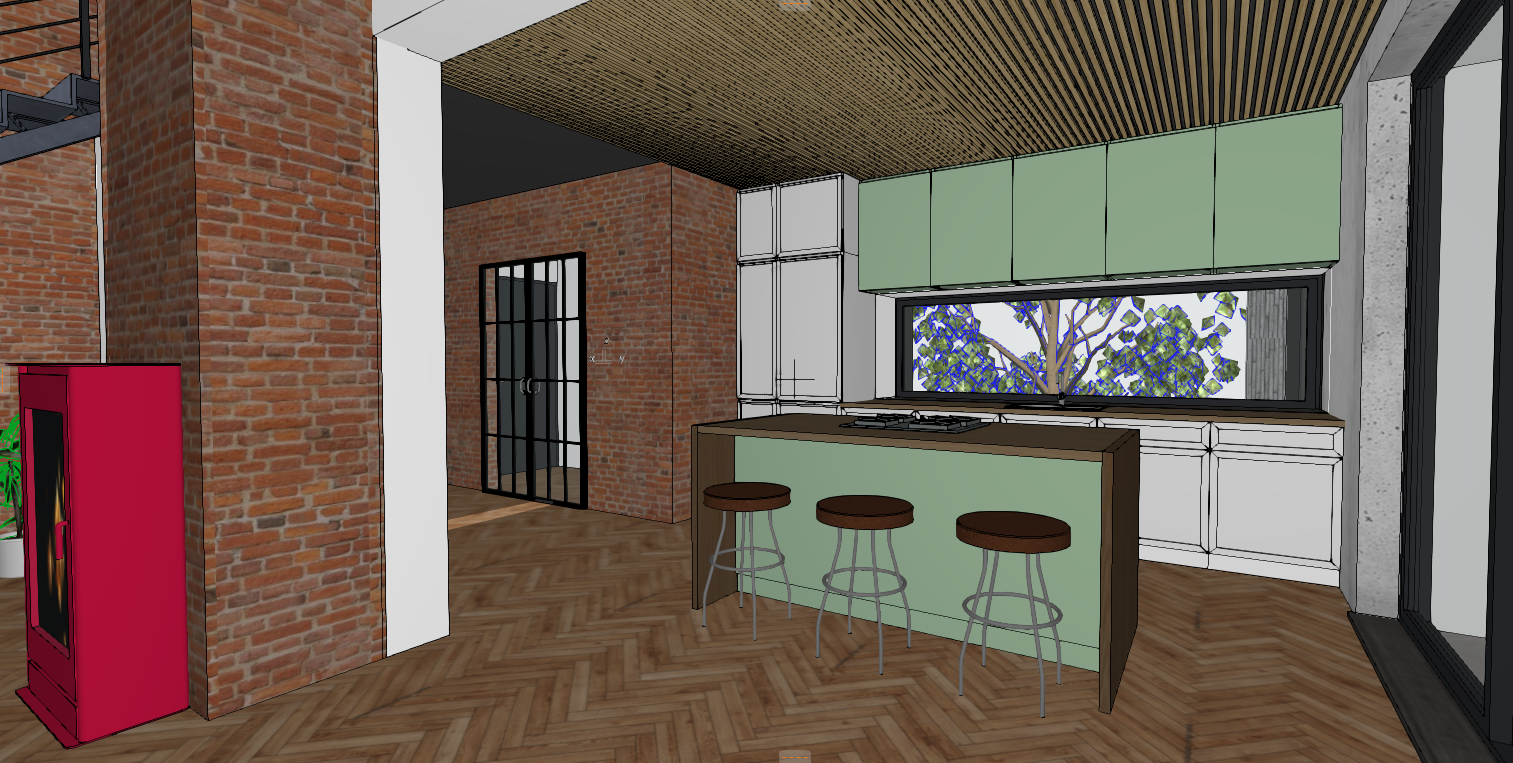 ultra photorealistic interior photograph of a modern loft living room with open kitchen same composition proportions and furniture arrangement as reference scene setup dark green natural leather sofa and armchairs with fine creases and subtle gloss variations wooden herringbone floor oak tone warm tactile red brick wall with soft warm reflections and realistic color bleeding on adjacent concrete surfaces concrete and plaster structure with matte finish illuminated by linear led strips along ceiling and corridor edges 3000 k large panoramic window opening to a sunlit forest at golden hour volumetric sunlight rays depth haze natural reflections on glass warm cinematic light balance sunlight 3700 k led accent 3000 k subtle bounce from wooden floor micro details slight wrinkles on leather upholstery visible stitching fine wood grain and mild wear on table edges light dust fingerprints and micro imperfections on kitchen counter and glass surfaces rumpled rug edges soft shadow folds paper magazine with folded corner on table two ceramic mugs with subtle steam faint light reflection on mug glaze indoor plants with realistic translucency under sunlight camera setup 35 mm full frame lens f 2 8 iso 200 hdrx dynamic range focus on sofa and table area mild background bokeh exposure balanced for natural daylight no clipping in highlights real lens imperfections light vignette minimal chromatic aberration soft corner falloff rendering lighting goals realistic reflections on floor and glass soft bloom on led strips golden light grazing along walls atmospheric haze near window to enhance depth gentle shadow gradient across room for cinematic composition post processing color grading kodak portra fujifilm classic chrome palette warm mid tones desaturated greens gentle contrast curve subtle film grain 0 3 natural tone mapping aces warm cozy yet elegant color balance perfect for high end architectural magazine mood composition serene cinematic editorial quality scene with tactile realism light evokes calm late afternoon warmth every material feels authentic physical and photographically lit