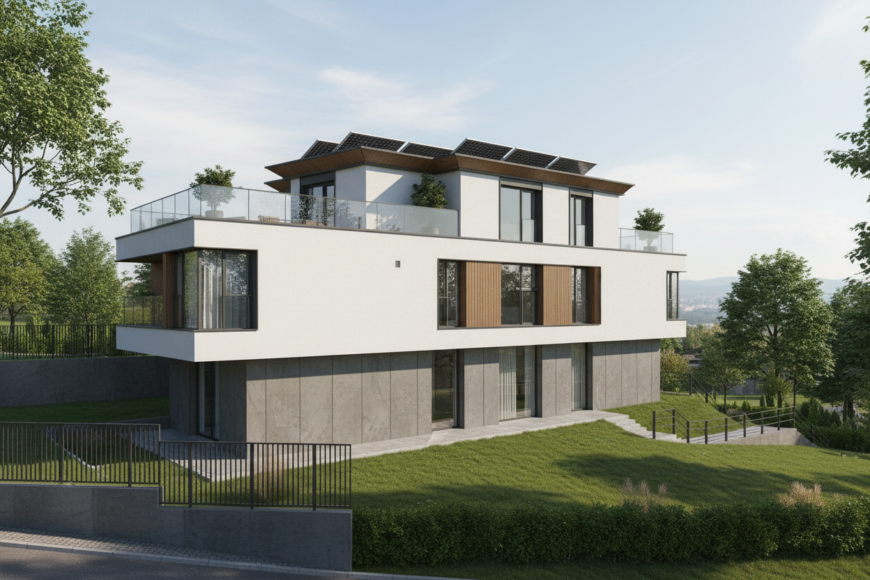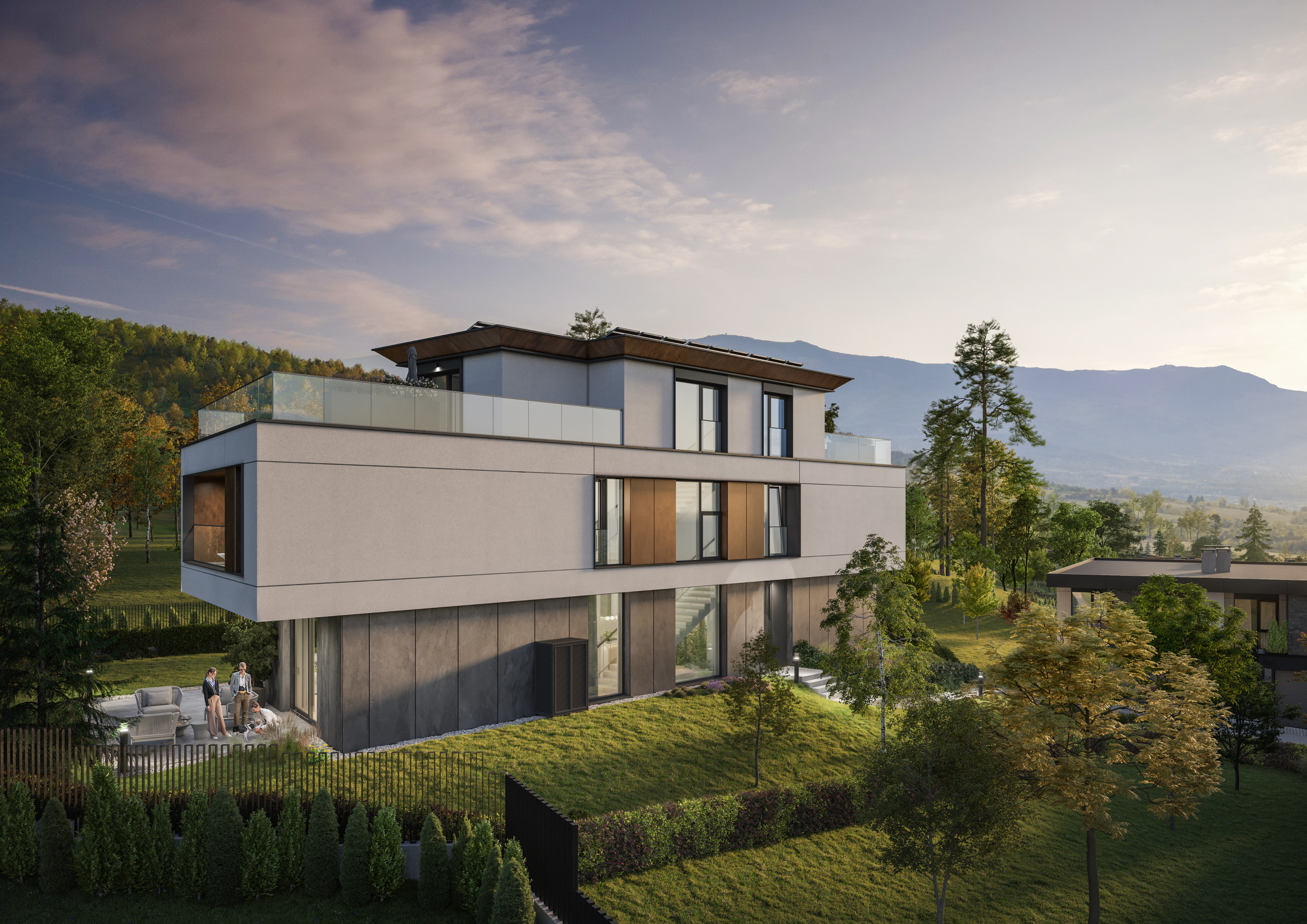 exterior shot use the environment and materials from the mood board use the perspective of the mood board