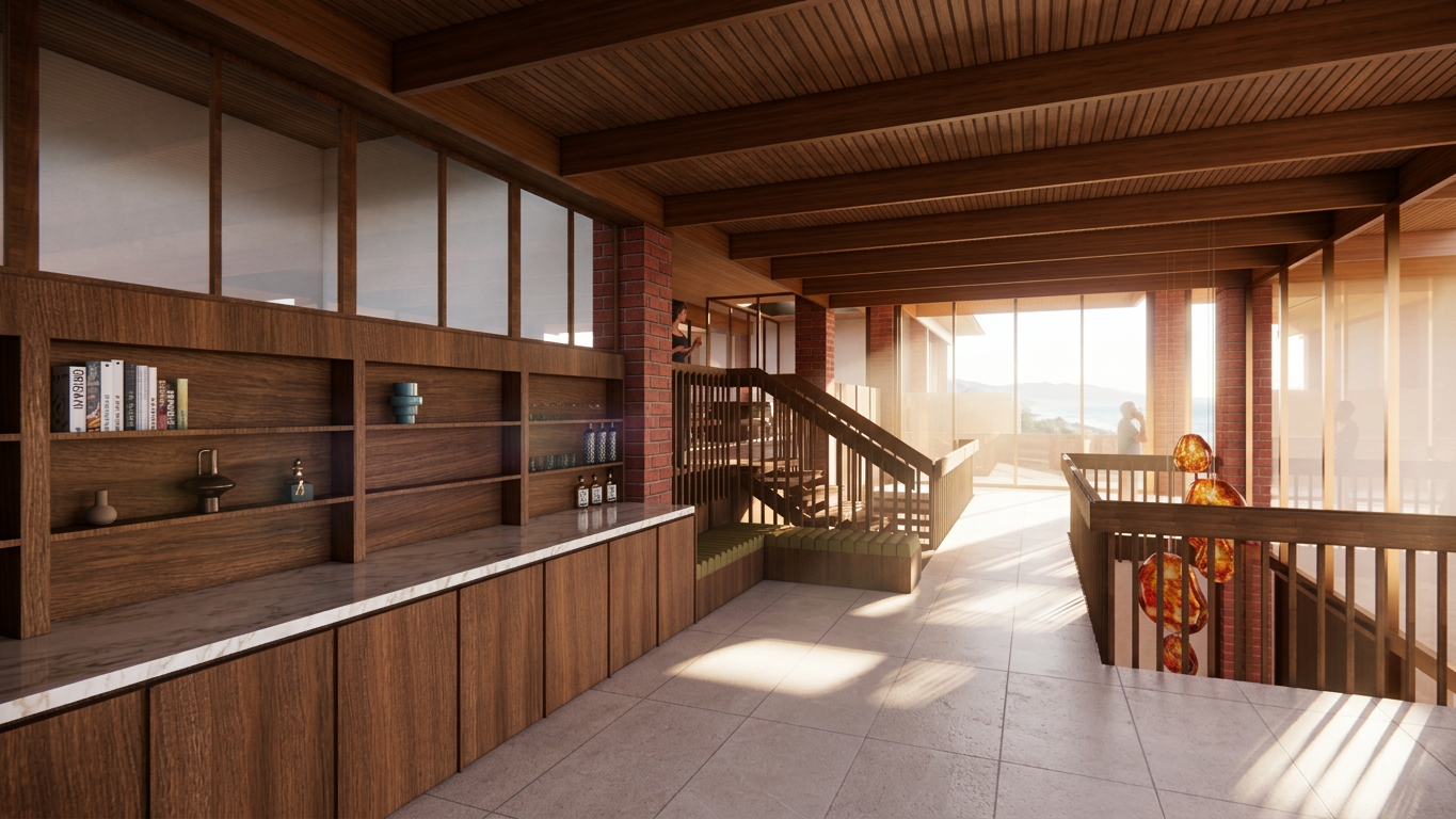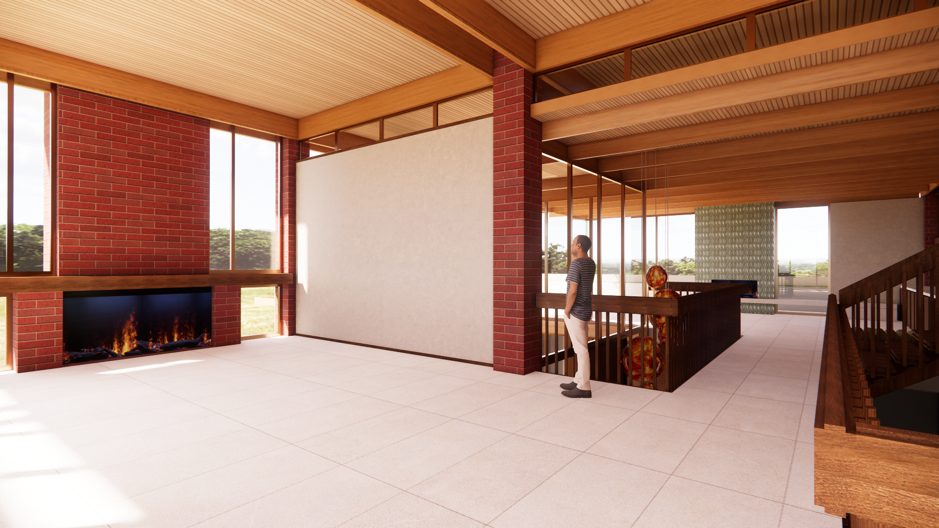 render a photorealistic 3d perspective of this mid century modern masterpiece house in a los angeles ca keep model geometry the same windows doors roof walls do not change the view only enhance the current materials and add warm sunlight with atmospheric depth render in hyper realistic architectural visualization quality 8k resolution