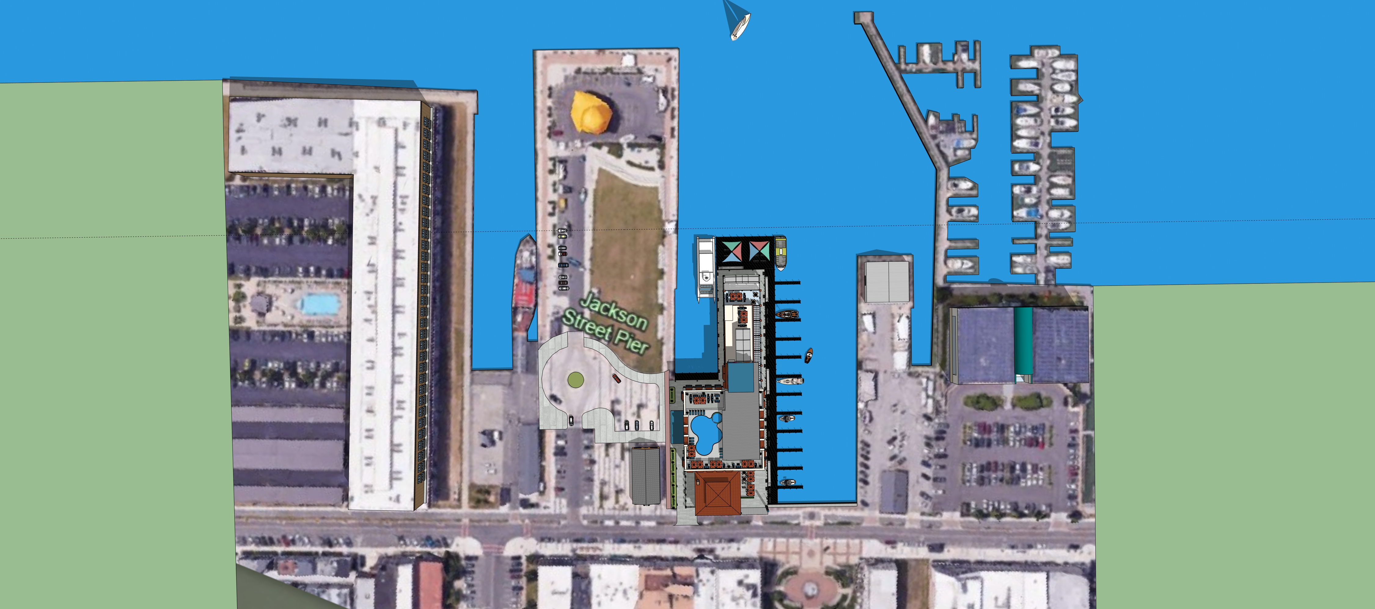 photoreal aerial paint over re render of the provided high resolution sketchup bird s eye view of a waterfront pier development in sandusky ohio on lake erie match the camera position straight down bird s eye perspective framing and overall site composition exactly to the input image this is a high aerial plan oblique site view showing the full pier surrounding water adjacent downtown edge park space marina slips and the complete development layout keep the same viewing angle and do not crop zoom rotate flip mirror or shift the view absolute site geometry lock critical treat the input as a fixed underlay do not move resize warp redesign mirror or reinterpret any building footprints pier edges shoreline edges marina slips boardwalks streets sidewalks parking lawn park shapes pool layout dock geometry or site elements keep all object silhouettes and site relationships in the same pixel locations roof geometry lock do not alter any roof plans roof footprints roof edges roof slopes ridge lines parapets canopies rooftop enclosures rooftop decks or rooftop equipment layouts keep all roof geometries exactly as modeled in plan and in silhouette maintain the exact site composition as shown the full pier layout remains exactly as modeled the park area remains exactly where shown the hotel mixed use buildings remain exactly where shown the pool area remains exactly where shown marina slips docks gangways and boats remain in the same locations surrounding streets sidewalks and adjacent buildings remain in the same overall arrangement view output intent this image should read as a beautiful polished bird s eye site rendering clearer and more atmospheric than a raw model view but still faithful to the plan geometry prioritize site legibility activity landscaping water and overall composition over fa ade level detail this is a site render enhancement only do not redesign the buildings from above roof plans must remain exactly as shown in the input image architecture site intent render the development as a finished waterfront destination while preserving the exact modeled site plan and massing buildings should read cleanly and attractively from above pool terraces boardwalks shade structures and public spaces should be easy to understand the colorful feature box should remain vivid and legible as a site focal point the overall project should feel cohesive active and well designed do not redesign buildings or simplify the plan context place this is a bird s eye view of a great lakes waterfront development in sandusky ohio the surrounding context should feel like a downtown waterfront district with adjacent urban fabric water edges marina conditions and public park space keep the context believable but secondary to the main site the water should read as calm harbor lake erie water with attractive color variation reflections and subtle ripple texture activation people life populate the site with lots of small scale realistic activity appropriate to a bird s eye view pedestrians along boardwalks and sidewalks people in the park and lawn areas people on terraces and rooftops activity around the pool people near docks and marina edges some people in the end of pier waiting gathering areas cars parked and moving where appropriate a few boats in slips and along the waterfront at this scale people should read as lively site activity rather than detailed portrait figures the site should feel busy successful and well used but not cluttered lighting season mood summer mostly sunny skies approximately 1 00 pm use bright vibrant midday sunlight with clean clarity and short well defined shadows the overall effect should be crisp attractive and presentation ready with a lively daytime feel avoid flat lighting and avoid dramatic sunset effects landscape site surfaces landscape and hardscape are important in this view make them read clearly and attractively the park lawn should look lush and well maintained walks plazas and boardwalks should have clear texture and material differentiation pool water should read clean and inviting streets parking and sidewalks should look realistic but not overly gritty waterfront edges marina slips and docks should read clearly from above materials overall use realistic but restrained materials appropriate for an aerial rendering buildings should read cleanly with believable light dark variation roofs should read as finished roof surfaces not flat blank colors water should have depth and reflection variation paving decking and lawn should be clearly differentiated avoid overly smooth plasticky cartoon like or game engine looking surfaces negative instructions narrative must follow do not change the camera angle bird s eye viewpoint perspective horizon framing or site composition do not move resize warp redesign mirror or reinterpret any building footprints pier geometry marina slips streets sidewalks parking park areas pool layout docks or waterfront edges do not rework simplify or reinterpret any roof geometry do not change roof footprints parapet outlines sloped roof forms canopy shapes rooftop pool layout rooftop deck layout or rooftop equipment placement keep all roof plans exactly as modeled do not invent new buildings or remove existing site elements do not change the overall site plan do not over detail the fa ades at the expense of site clarity do not make the rendering cartoony plasticky overly glossy or diagrammatic do not use exaggerated colors or fake looking water do not leave the site empty the project should feel active and populated with believable public life across the full development