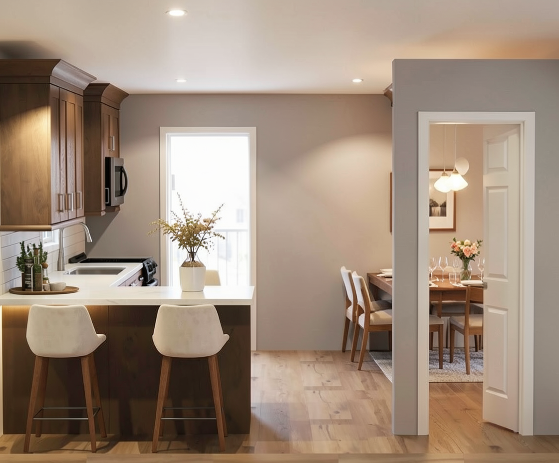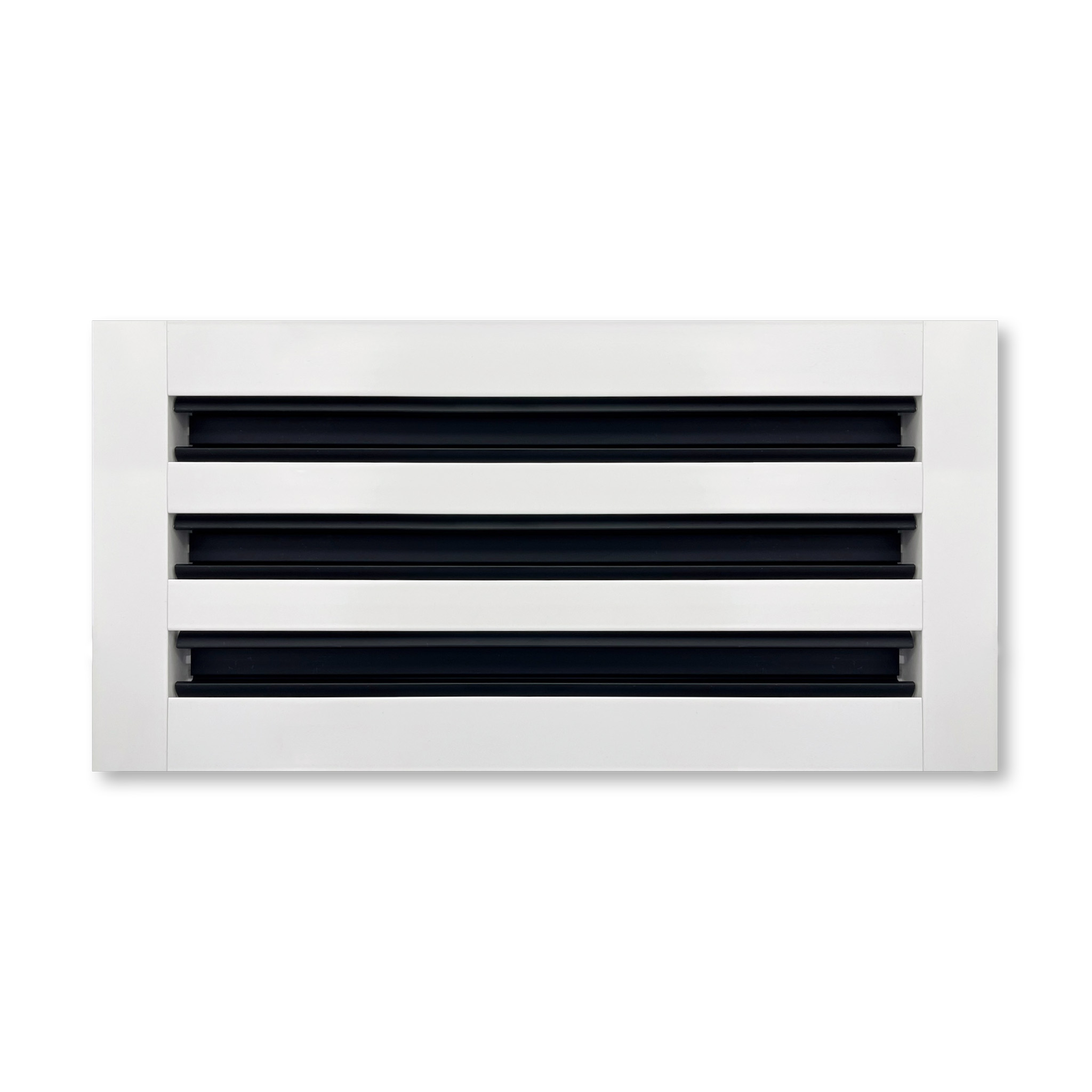 a photorealistic interior floor vent register set into light ash toned wide plank hardwood flooring shot from a high angle looking down the vent cover is white off white with three parallel linear slots and a mitered 45 degree beveled frame edge on all four corners giving the cover a refined furniture grade appearance the vent sits flush with the floor in the background soft natural light from a large white framed window sheer linen curtains pooling on the floor to the left and the light wood frame and upholstered seat of a scandinavian style chair to the right a light beige area rug is partially visible at the bottom edge soft diffused daylight neutral warm white tones throughout architectural product photography style ultra high detail 8k