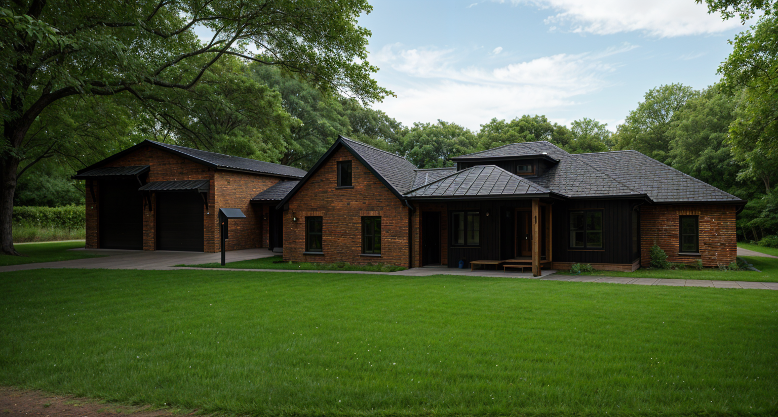 contemporary two story fa ade with smooth concrete panels in a pronounced grain texture bronze metal accents and elegant bronze lattice details large glass windows reveal a warm well lit interior urban brooklyn street under an elevated train line cinematic dusk not too dark 4 pm atmosphere ultra photorealistic architectural render