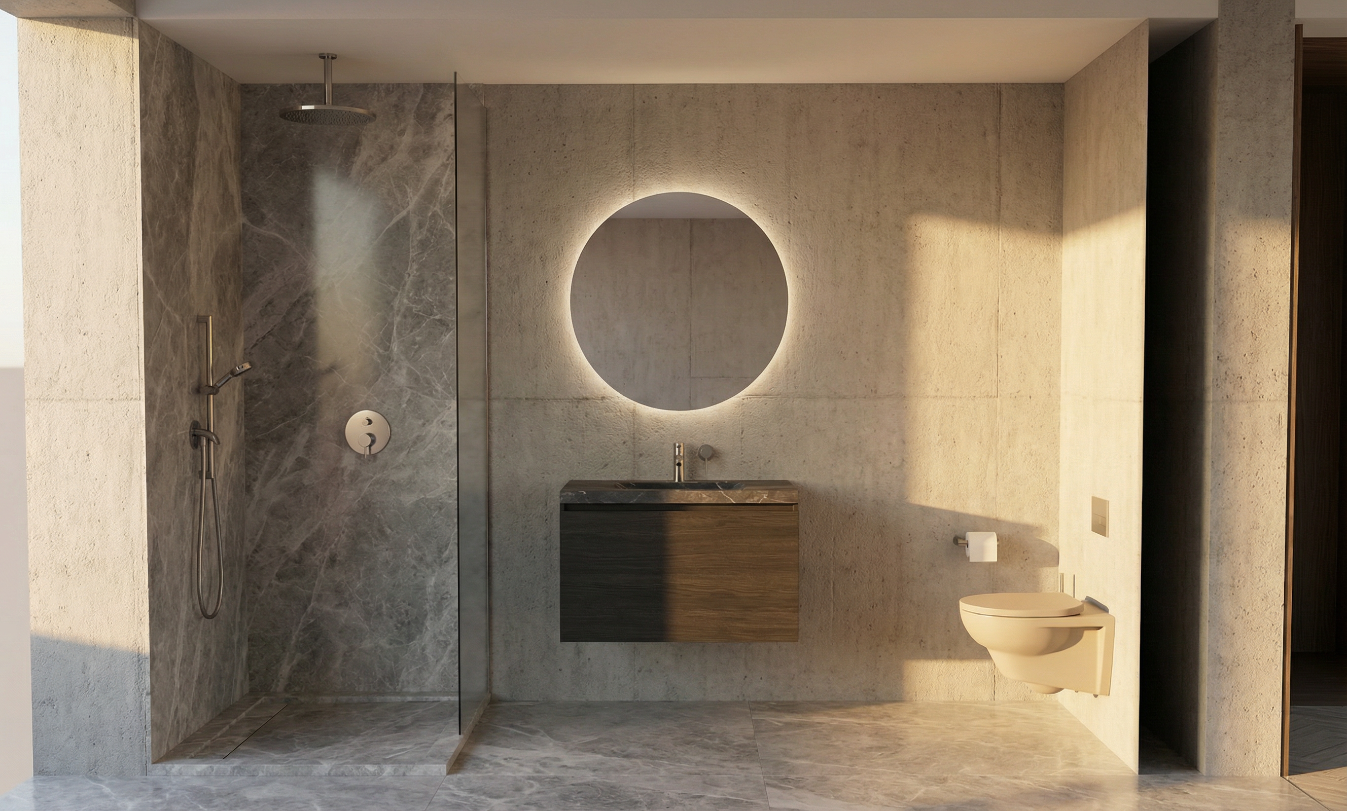 genau dieses rendering berarbeiten fotorealistisches innenraum foto exakt dieselbe perspektive und kameraposition wie das hochgeladene referenzbild 100 identische raumgeometrie exakt gleiche m belanordnung weiches nat rliches tageslicht leicht schr g einfallende sonne raum k nstlich ausleuchten sanfte realistische schatten blickrichtung ist nach osten sonnenlicht kommt von s den realistische materialien echte holztexturen stoff mit leichten gebrauchsspuren hochwertige oberfl chenreflexionen lavabo inklusive unterbau aus marmor collemandina grigio in braungrau dunkel dahinter eine vola wandarmatur edelstahl vollkommen rahmenloser und hinterleuchteter spiegel links neben dem lavabo ist die dusche thermostatmodul axor select mit stabhandbrause und grosse wandtellerkopfbrause w nde in der dusche und boden collemandina grigio in braungrau alle anderen sichtbaren w nde sind sichtbeton toilette ersetzen mit moderner toilette vignoni vertigo wandh ngend in farbe sabbia toilettenpapierhalter an der wand sehr moderner minimalistischer look nat rliche farbwiedergabe golden hour feeling das bild muss wie eine professionelle fotografie aussehen es soll ein echtes und reales foto sein canon eos r5 35 mm festbrennweite f 2 8 hyperrealistisch dslr qualit t raw aufnahme 8k aufl sung extrem scharf perfekte tiefensch rfe professionelle architekturfotografie