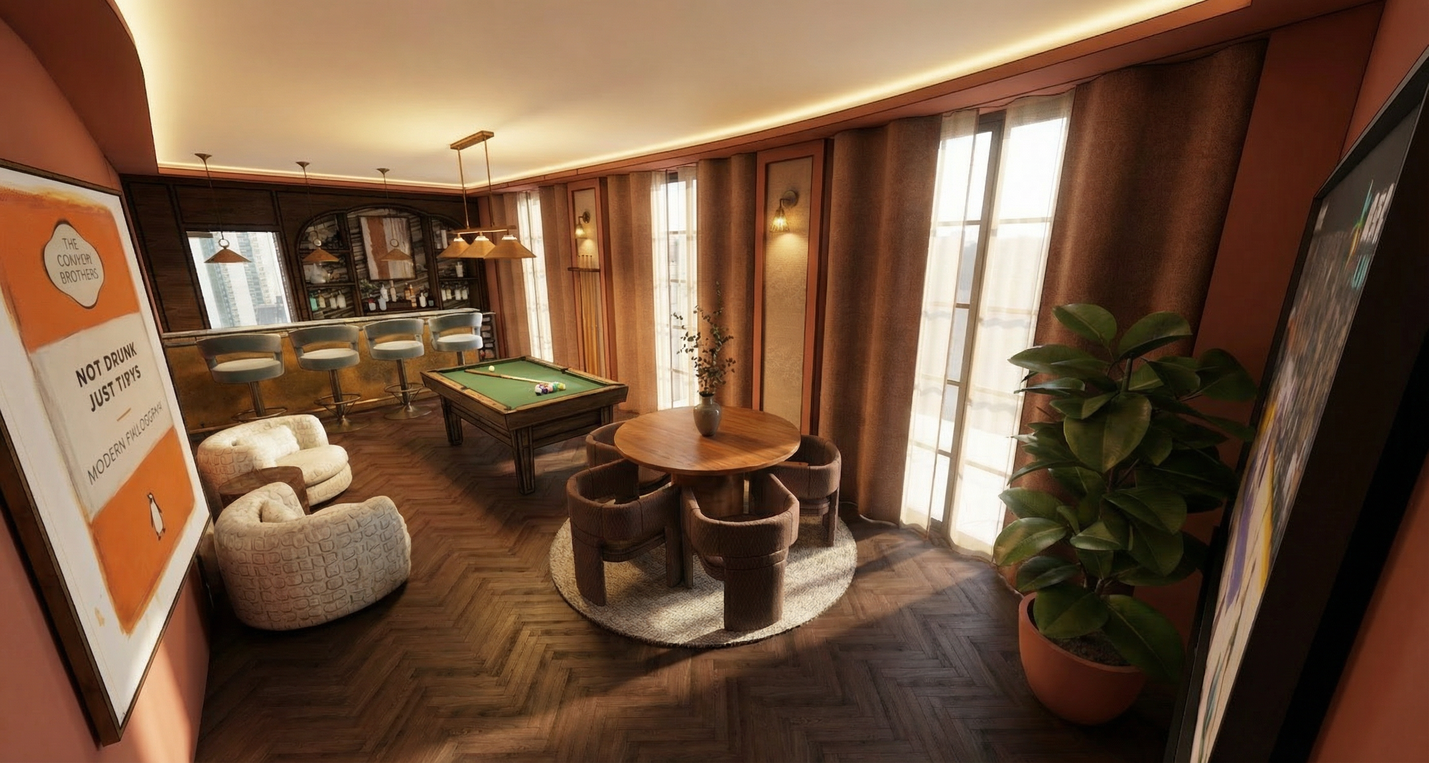 render a modern holiday park with black and timber clad lodges should be set in spring in the british countryside with native planting and light foliage there should be a red brick housing estate in the background and a red brick care home