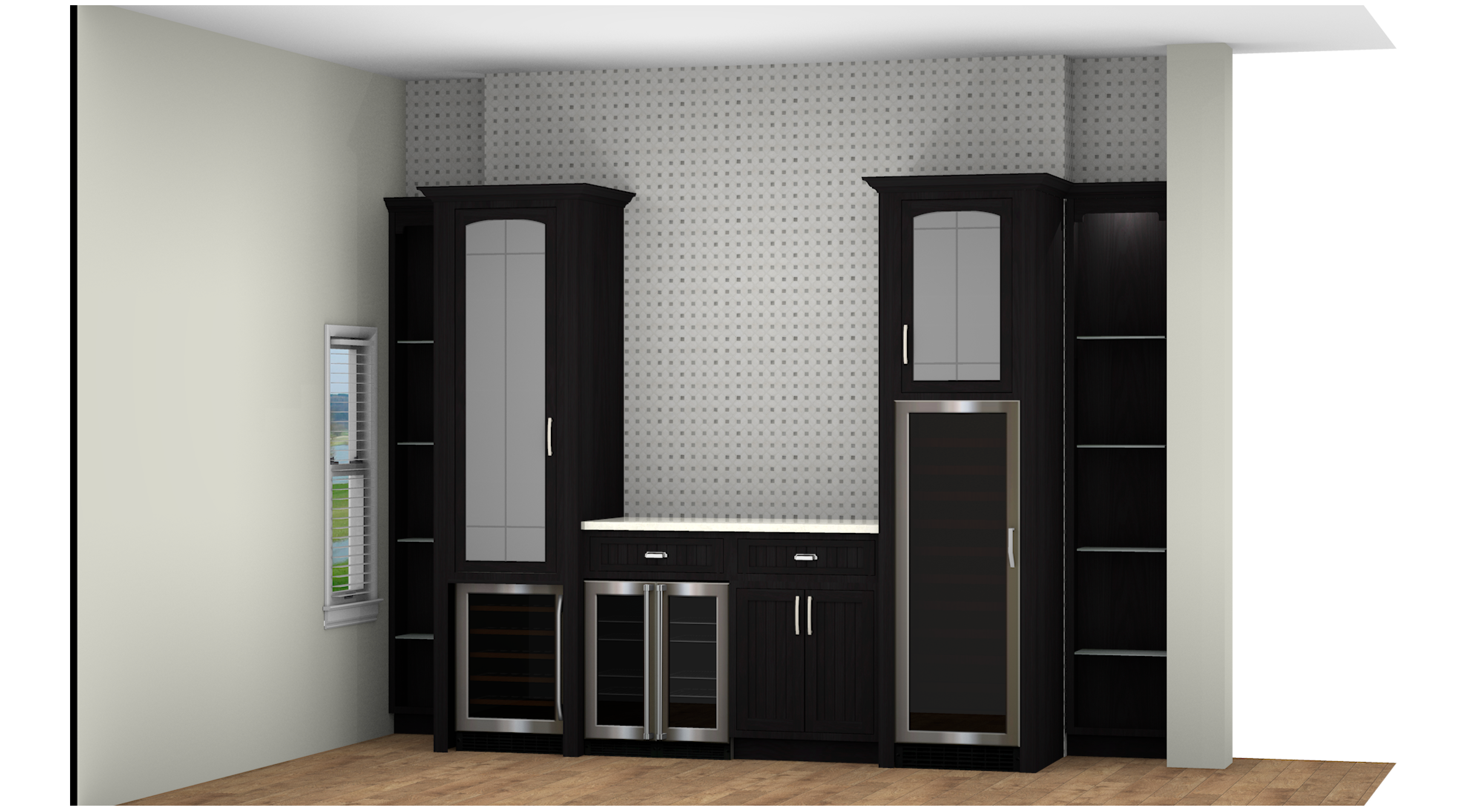 add glass shelving between 2 tall towers add crown molding at top of wall and a ceiling detail stage the bar and shaving as a bourbon whisky bar and add lighting where appropriate