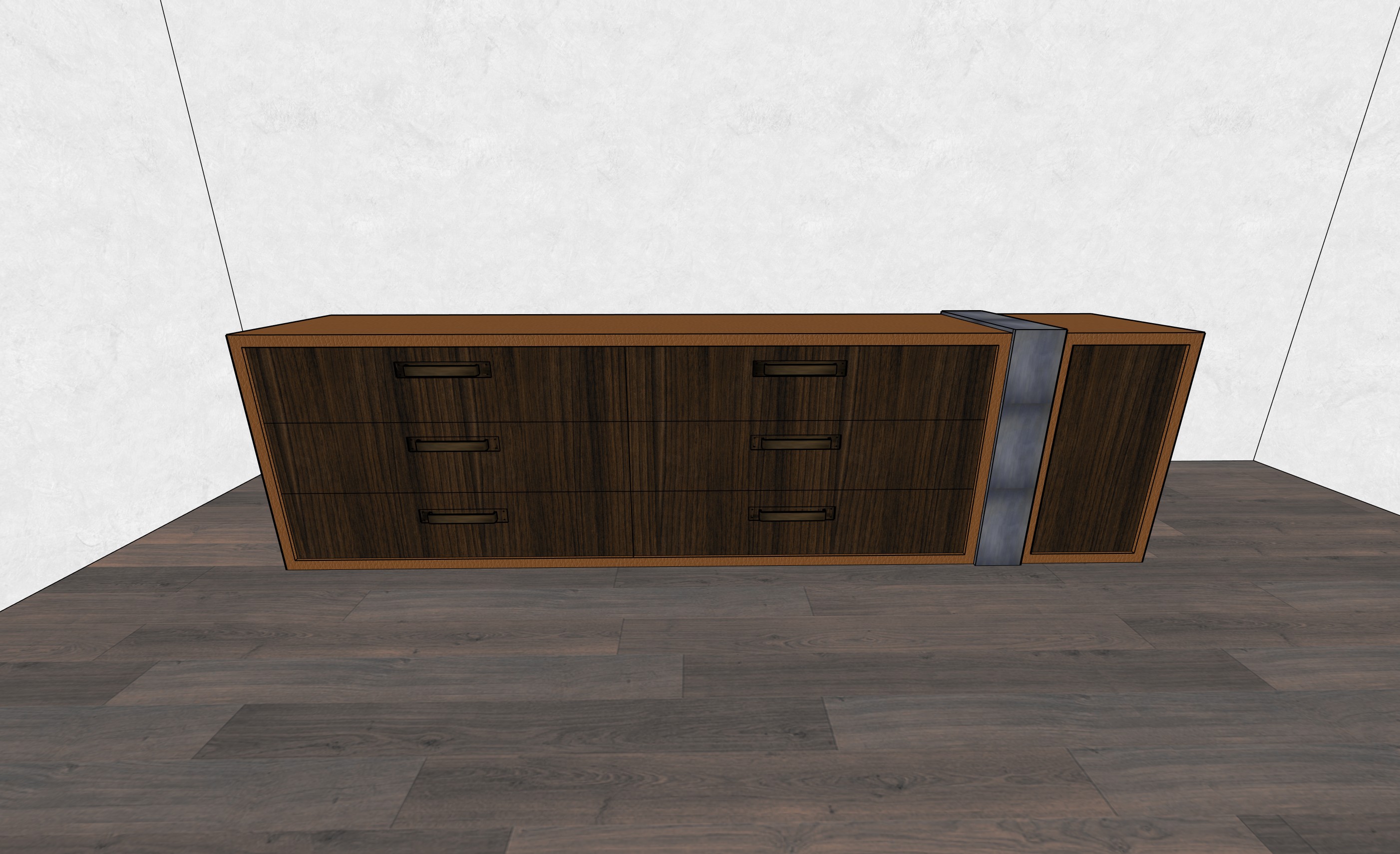 render this more photo realistically the surround is cognac leather the drawers are dark walnut wood and there is a forged silver strip accent on the right do not change anything or add anything keep materials and textures the same