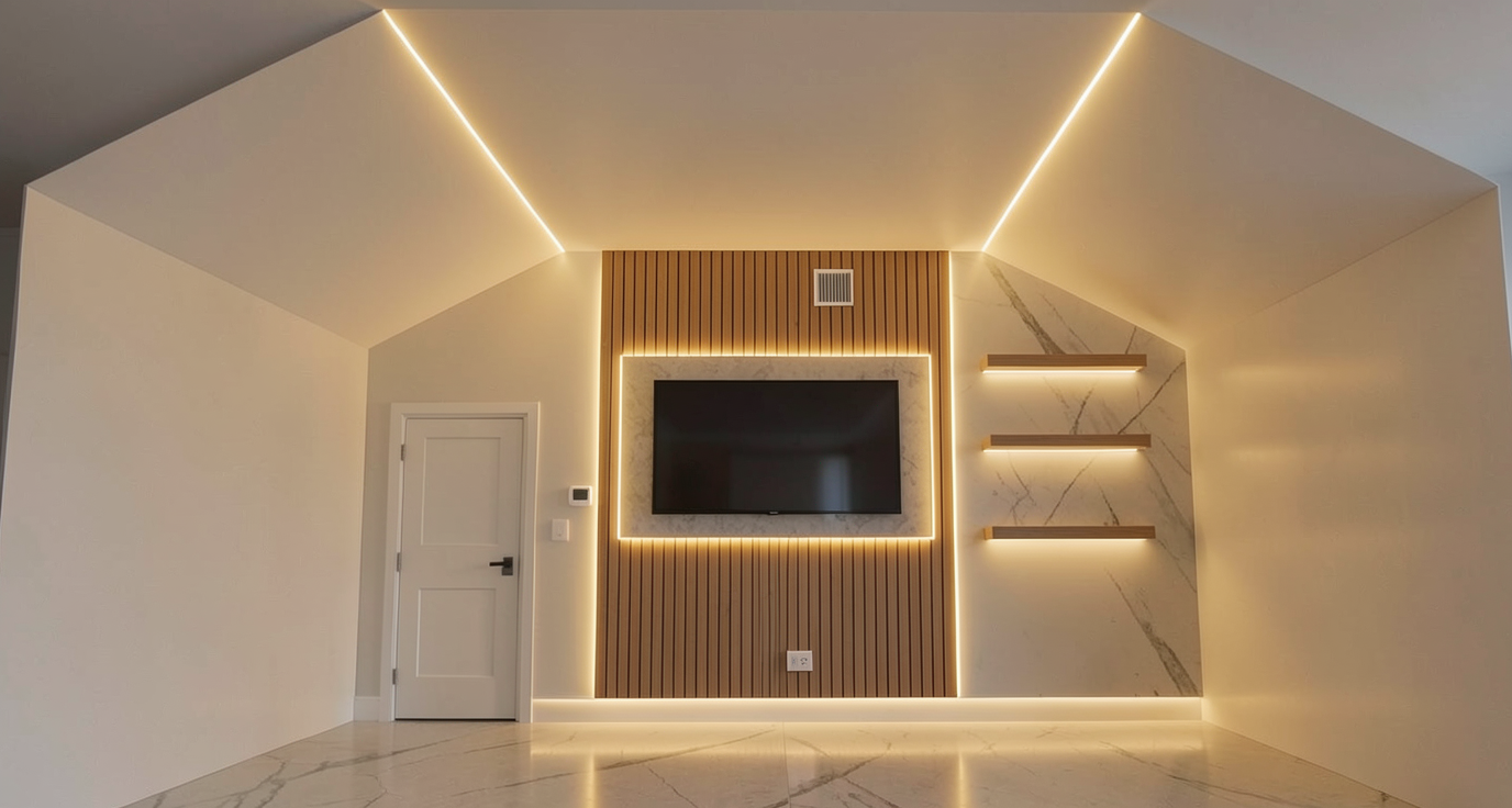 transform the wireframe perspective into a high resolution photorealistic architectural visualization while strictly maintaining the defined colors materials and geometry geometry critical the geometry must remain strictly unchanged do not alter proportions volumes alignments openings floor boundaries or architectural elements no reinterpretation of construction details maintain the exact camera position and perspective all drawn separation joints trennfugen must be executed precisely as shown flooring revised entire floor surface throughout the space in dark cherry wood plank parquet riemenparkett kirschbaum dunkel calm even appearance with subtle natural grain high quality finish matte to satin sheen no tile flooring anywhere under the fireplace maintain the clearly defined small rectangular slab zone as drawn material distinction must follow the geometry exactly no reinterpretation of floor zoning follow the drawing strictly kitchen materials main kitchen fronts in a light sand tone matte lacquer finish precise even front divisions with consistent joint patterns no visible fixings handle definition important the anodized aluminum handle profile natural aluminum color satin metallic sheen is visible only on the front below the built in ovens and on the front directly to the left of it all other fronts are handleless only the black handles on the built in ovens are additionally visible exactly as drawn countertop in dark grey engineered stone kunststein calm and understated fine subtle texture semi matte sheen restrained realistic reflections kitchen backsplash in the same material as the countertop identical dark grey engineered stone front differentiation the two front kitchen elements on the left foreground are rustic swiss stone pine arvenholz rustikal natural grain authentic but not exaggerated the three kitchen fronts to the right foreground are rustic stone pine with dark smoked glass infill smoked glass low transparency subtle depth visibility not mirror like interior of these three cabinets finished in the same light sand tone as the remaining kitchen fronts equipped with restrained decor books and tableware interior shelves tablare also in smoked glass precise craftsmanship detailing clean material transitions between wood lacquer stone and glass fireplace fireplace and flue pipe entirely matte black metal the small rectangular slab directly beneath the fireplace must remain clearly defined according to the drawing electrical decor electrical outlets only where explicitly drawn no additions decor minimal contemporary and restrained no clutter no over staging lighting natural daylight through generous window fronts soft realistic shadow formation subtle reflections on engineered stone and smoked glass no artificial lighting effects no dramatic highlights atmosphere calm residential high quality emotionally restrained focus on material authenticity craftsmanship precision and spatial clarity authentic swiss living quality rendering style photorealistic architectural visualization natural colors and realistic textures high detail depth in cherry parquet arve wood smoked glass lacquer and engineered stone no showroom look no dramatic effects strong emphasis on material realism precise geometry and handcrafted quality photorealistic physically based rendering sharp material definition balanced realism