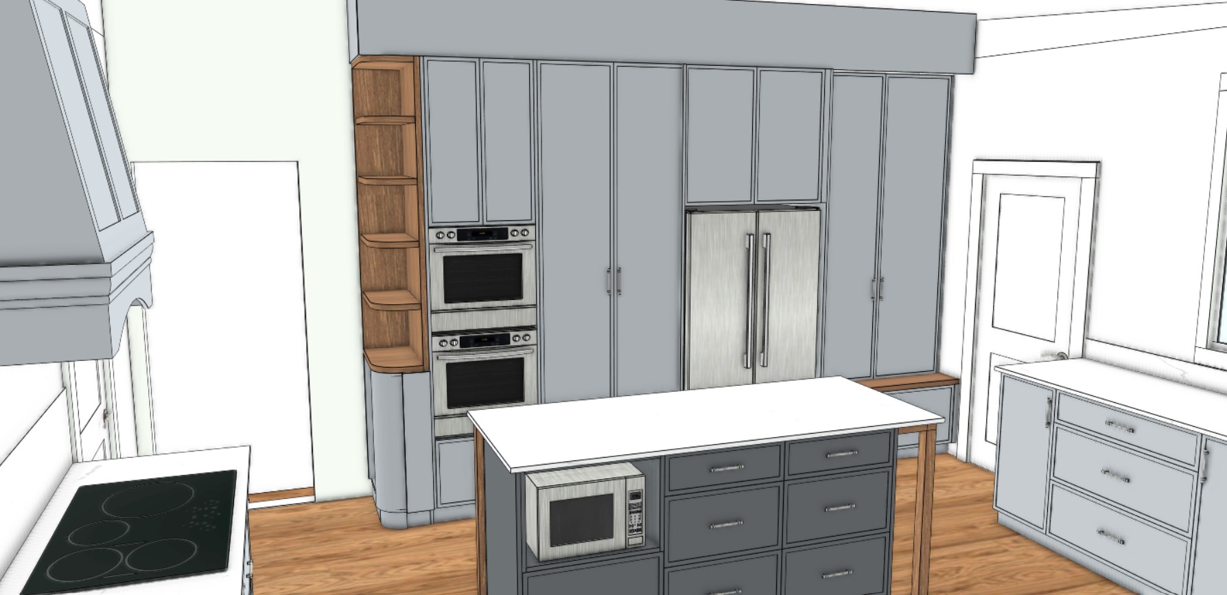 add kitchen decor add natural light coming through add downlights in ceiling to brighten space have someone standing at island make the island a darker charcoal cabinetry
