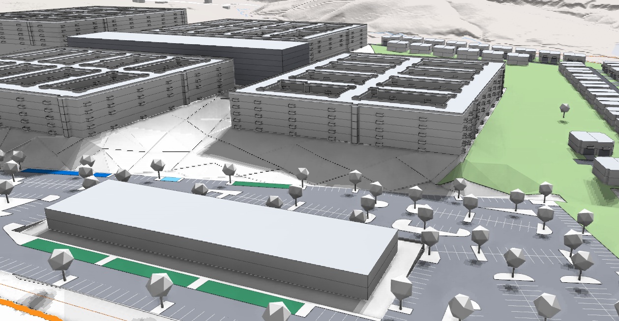 exterior shot create a classic architectural scene with a series of sleek rectangular buildings use red brick for the buildings exteriors to evoke a historical look add lush greenery with a variety of trees and grass in vibrant emerald green to surround the buildings the pathways and roads should be smooth asphalt in deep charcoal gray with clearly marked white lines for walkways include sky in the background with a soft azure blue and fluffy white clouds the atmosphere should be bright and open conveying a sense of innovation and harmony with nature parking lot should be full of vehicles architecture