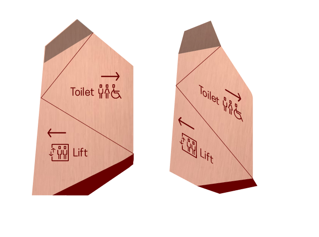 modernist exterior shot convert this adobe illustrator vector signage into a realistic 3d signage mockup place the design on a smooth metallic backing with realistic depth shadows and reflections use professional lighting to highlight textures such as hairline stainless steel finish with pvd coating with color of rose gold show the signage mounted on a modern wall indoor lobby with natural perspective photorealistic details and soft ambient lighting architecture