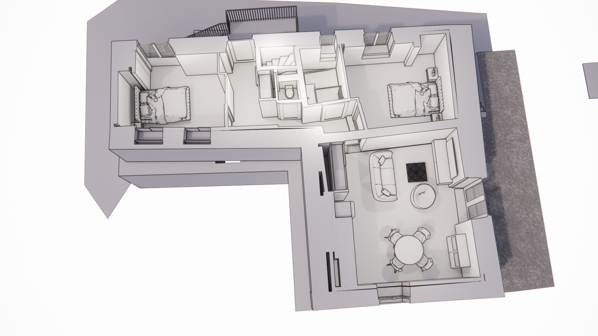 convert this floor plan into a realistic isometric 3d view of a full house show the space from an elevated angle with furniture walls and details visible 2d plans of the house use the same furniture as shows on the plan do not change the orientation of the floorplan