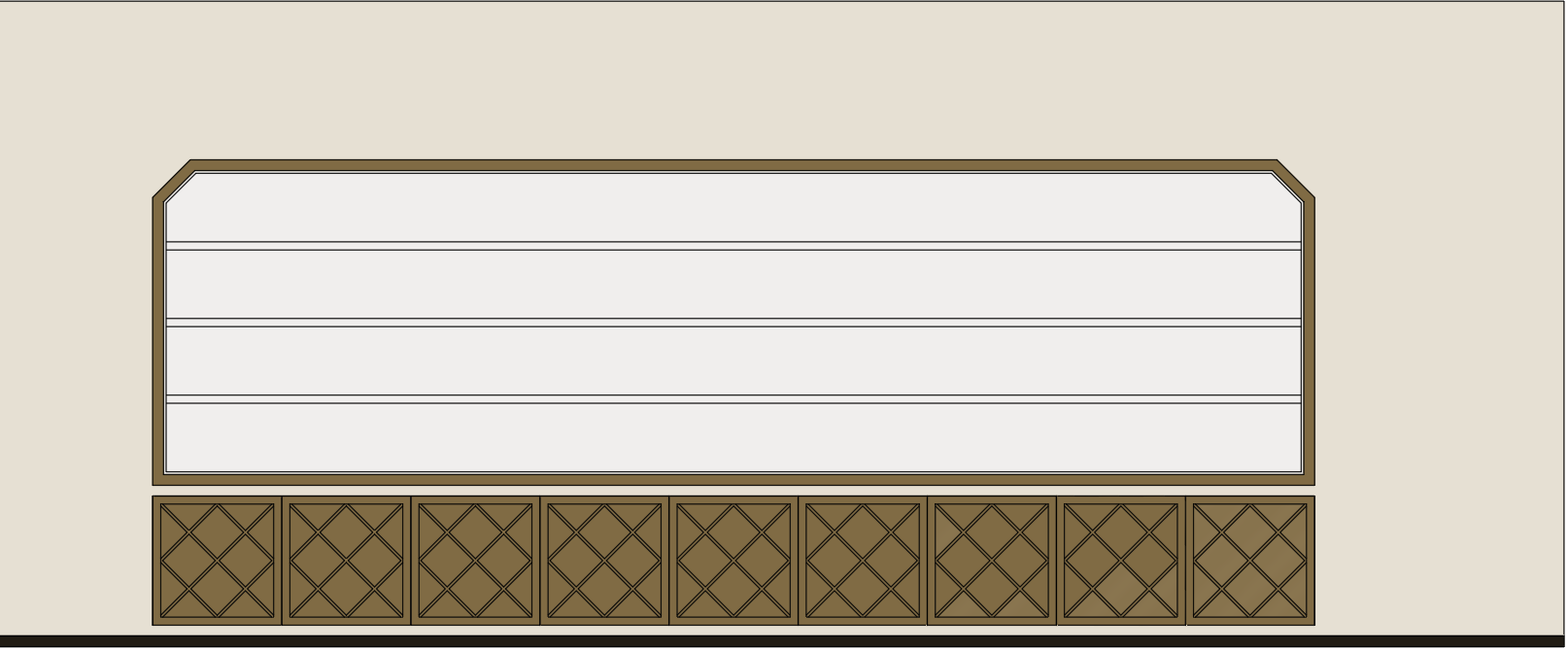 render this built in it is flush with the surrounding wall the wood is a warm oak the inside of the shelving and all interior of it including lip inside the side of the frame is all a white lacuqer