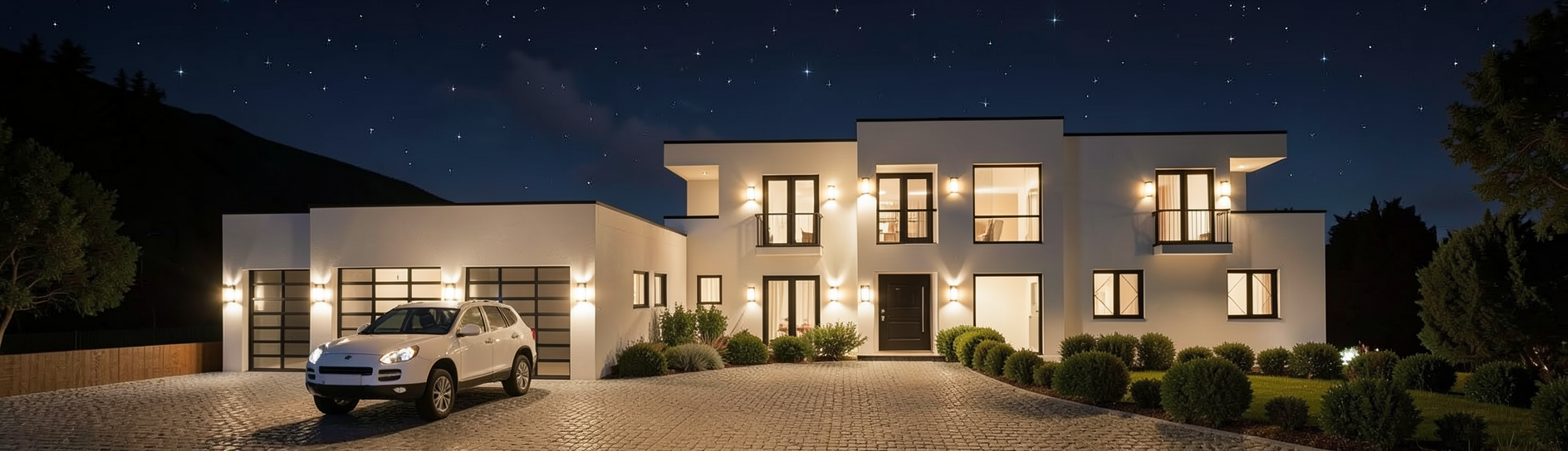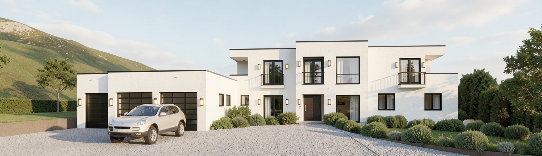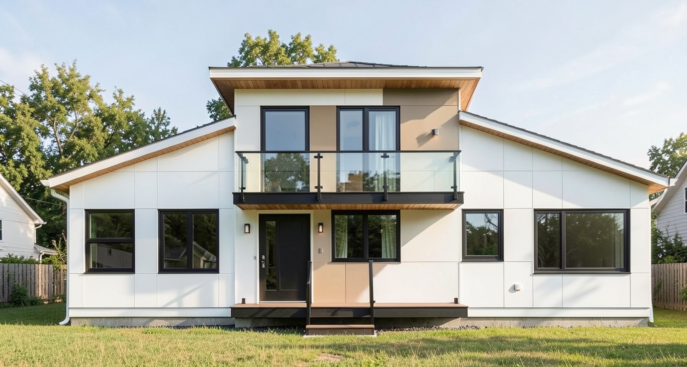 modern elevation in white smooth hardie panel lux westcoast series colour fawn on edge of windows and in centre all on one plane soffit is wood black window frames