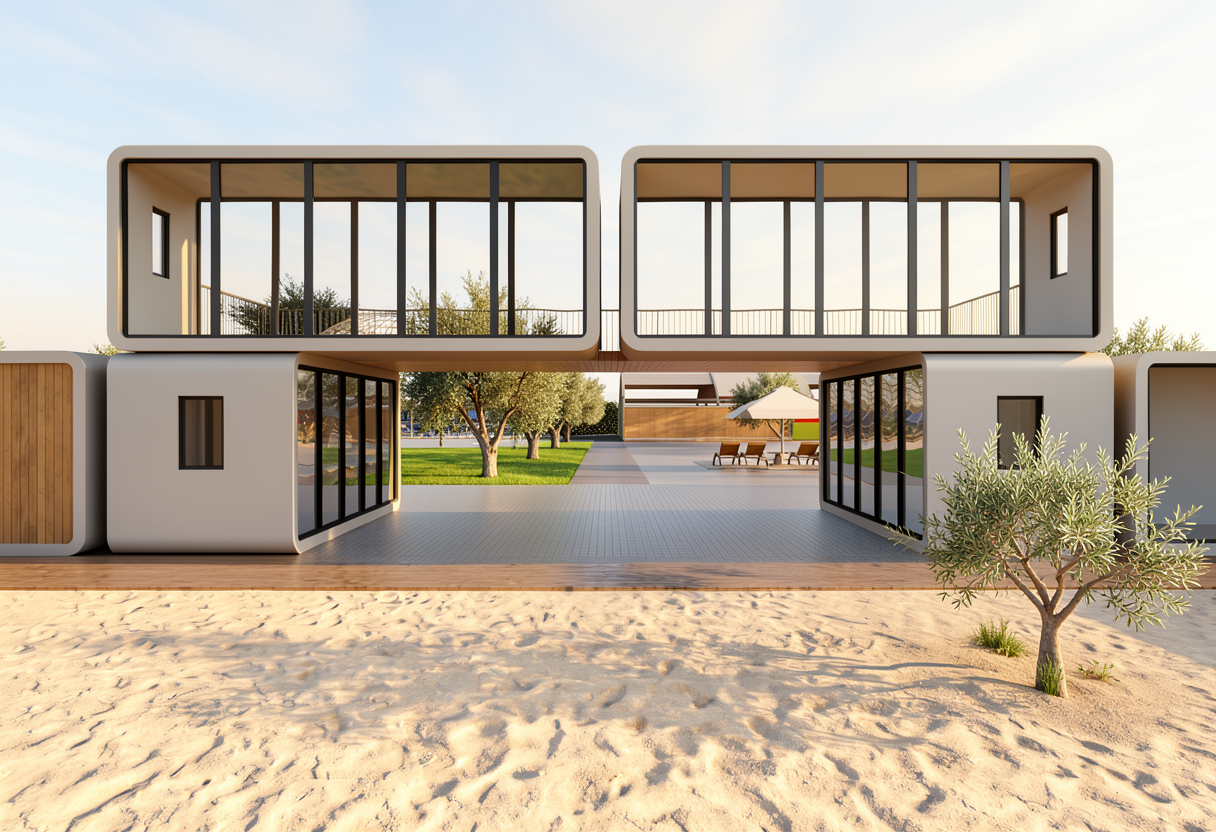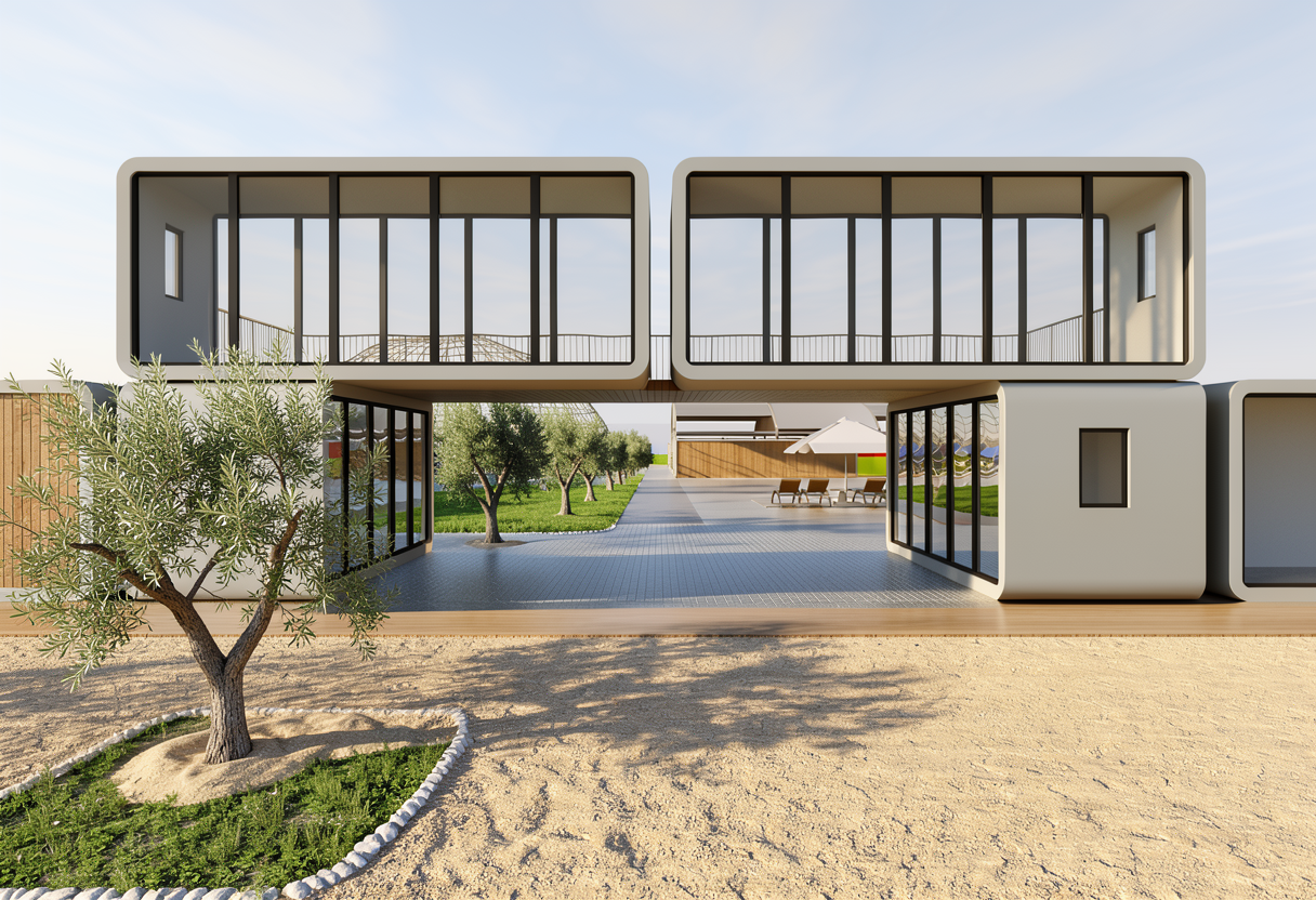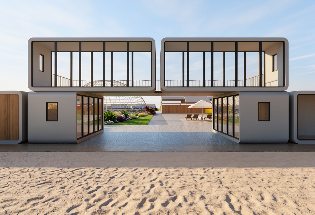 contemporary tropical residential complex identical to the reference image preserving the same composition perspective proportions and architectural layout modern low rise buildings with clean lines warm neutral materials large windows and integrated balconies central landscaped pathway with concrete stepping paths surrounded by lush tropical vegetation including palm trees dense greenery and layered planting set the scene at sunset golden hour with warm soft light long shadows and a subtle orange pink sky add ambient landscape lighting along the pathway and soft interior glows from the buildings enhancing a calm and inviting atmosphere maintain realistic materials reflections and shadows ultra realistic architectural render 4k cinematic composition no people keeping the central deck unchanged maintain original geometry and levels all other materials remain the same lush tropical vegetation with palm trees dense greenery and large leaf plants monstera ferns ultra realistic materials strong indoor outdoor connection 4k cinematic composition