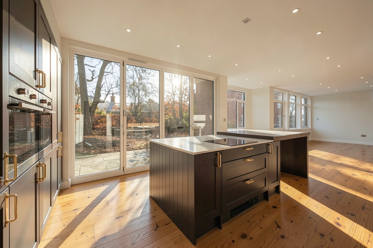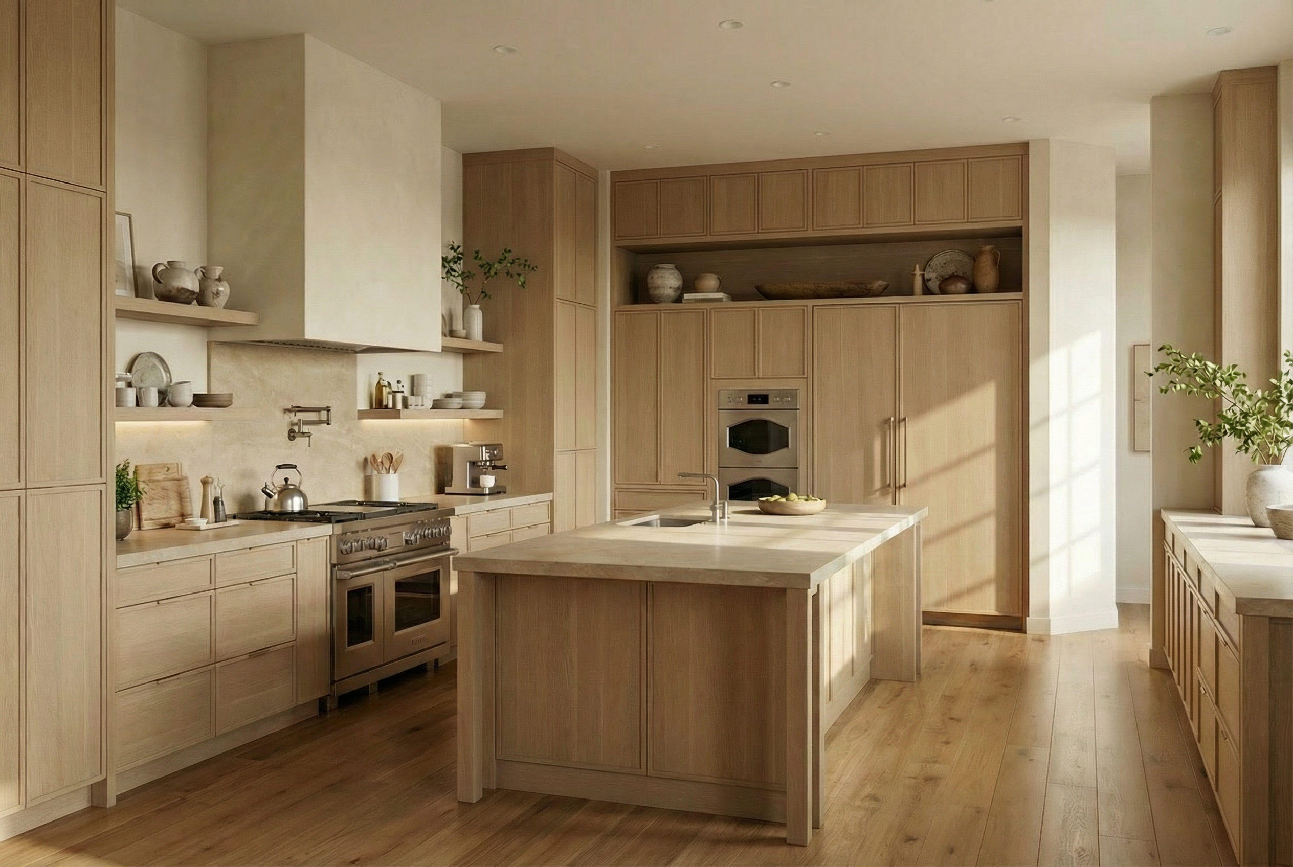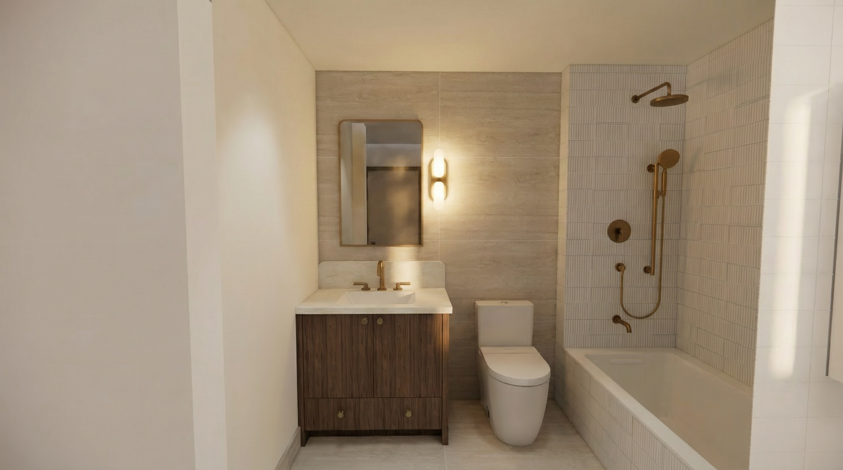contemporary tropical residential complex identical to the reference image preserving the same composition perspective proportions and architectural layout modern low rise buildings with clean lines warm neutral materials large windows and integrated balconies central landscaped pathway with concrete stepping paths surrounded by lush tropical vegetation including palm trees dense greenery and layered planting set the scene at sunset golden hour with warm soft light long shadows and a subtle orange pink sky add ambient landscape lighting along the pathway and soft interior glows from the buildings enhancing a calm and inviting atmosphere maintain realistic materials reflections and shadows ultra realistic architectural render 4k cinematic composition no people keeping the central deck unchanged maintain original geometry and levels all other materials remain the same lush tropical vegetation with palm trees dense greenery and large leaf plants monstera ferns ultra realistic materials strong indoor outdoor connection 4k cinematic composition