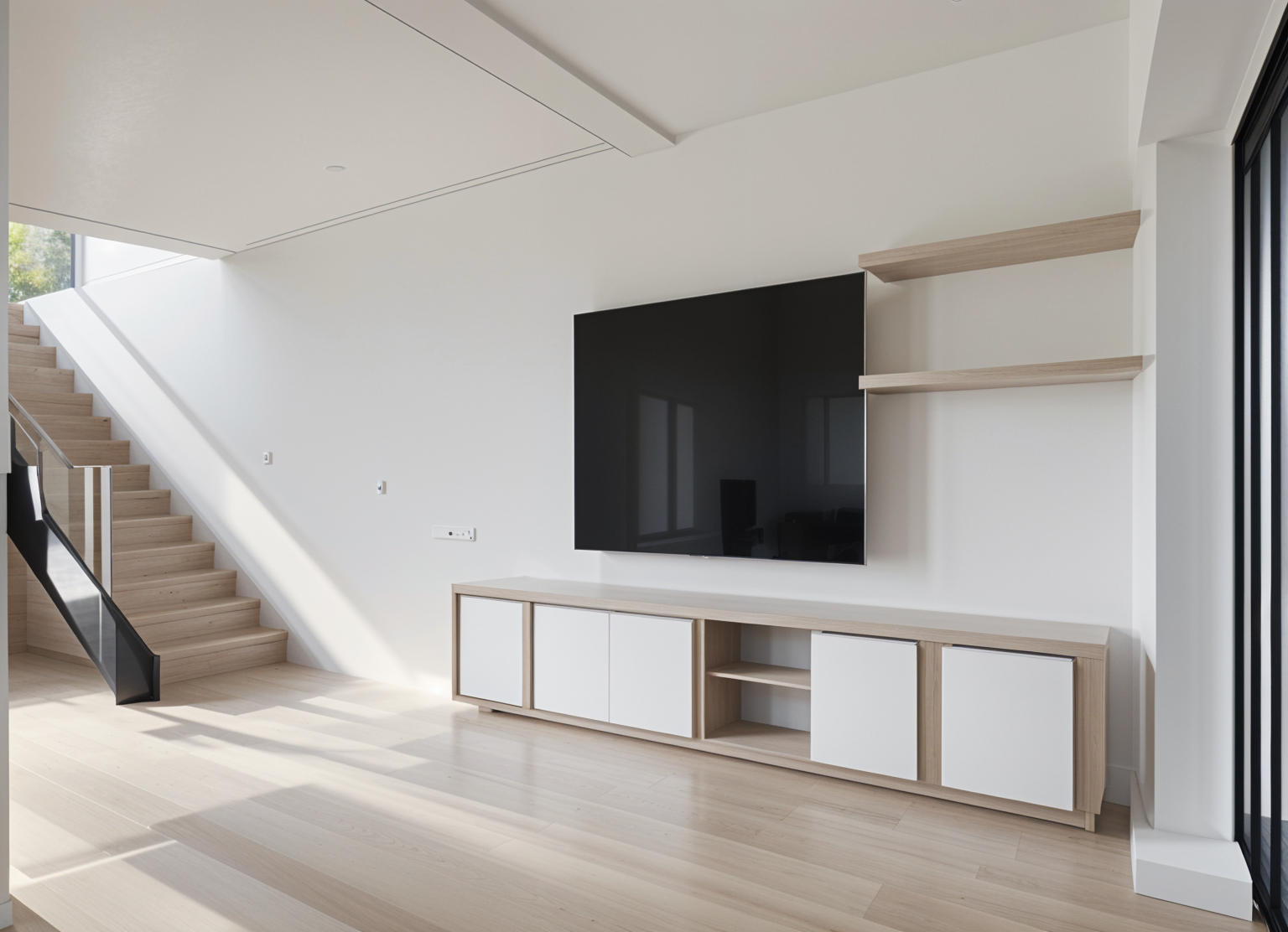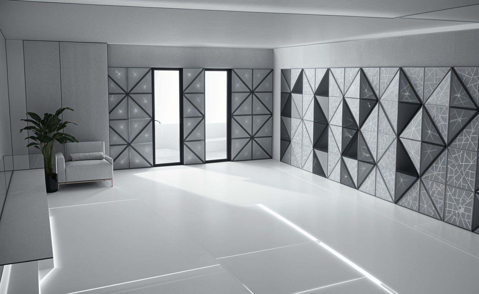 modernist interior shot the wall panel are geometric pattern with led lights within the triangles include led lighting in the ceiling give it a modern futuristic view have the photo be at night time architecture