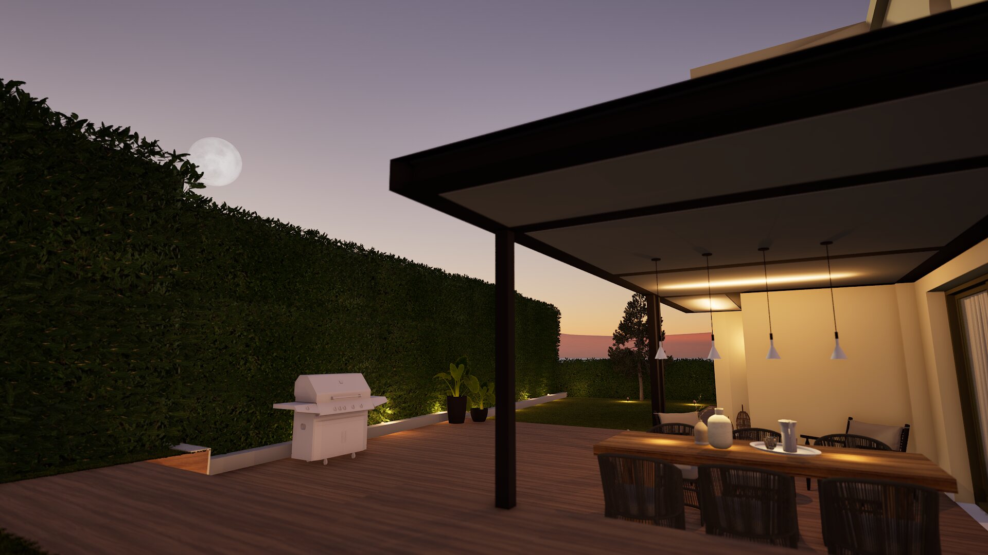 modern minimalist patio at sunset featuring a soft beige house exterior with smooth textures the patio floor is a rich warm brown wooden deck the dining area is under a sleek black metal pergola with a polished wooden table and elegant wicker chairs warm ambient lighting casts a cozy glow on the scene highlighting the neatly trimmed lush green hedges and tall trees in the background the atmosphere is serene and inviting enhanced by the soft purple and orange hues of the evening sky architecture