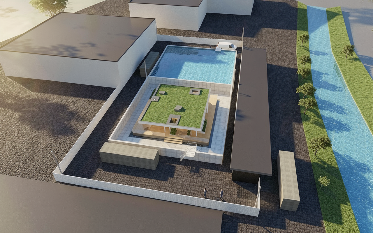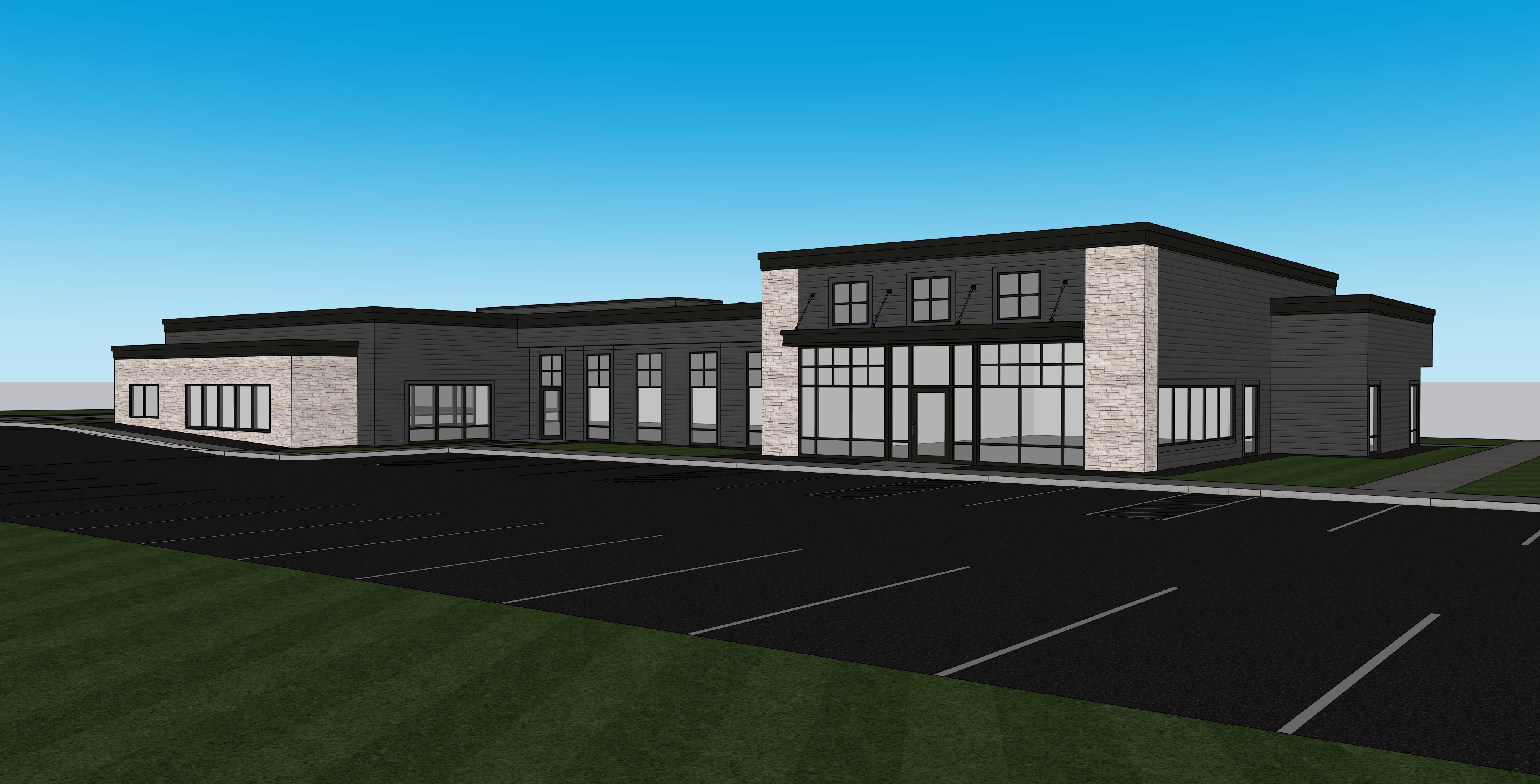 maintain all image geometry and textures create a hyper realistic image of this medical office building with cars in the parking lot there should be street trees and a grass median behind the building and beyond that should be another parking lot the dark horizontal siding should appear as painted wood siding with no corner trim the stone should be drystack ledgestone in the color shown the cornice should be black metal show well designed and manicured landscaping around the building with a mix of evergreen shrubs and flowering shrubs and perennials the grass should be shown highly realistic and well manicured this should be an early afternoon image on a sunny day with some clouds in the sky show shadows in the foreground as if trees are behind the camera