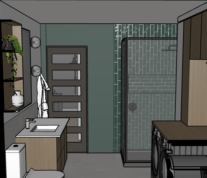 set the daylight to 2 pm less sunlight the green color is a forest blue green add recessed ceiling lights there are no people in the room use less glossy materials there is no door handle since it s a sliding door