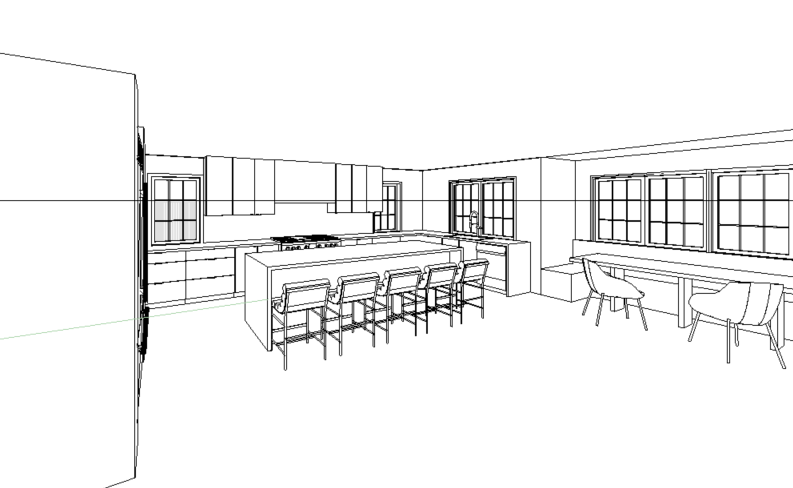 interior shot render this kitchen with soft warm colors add small down lights evenly spaced in the ceiling add ribbed glass pendants above kitchen island tahj mahal quartzite countertops and backsplash with greige cabinetry soft blue upholstery at banquette seating