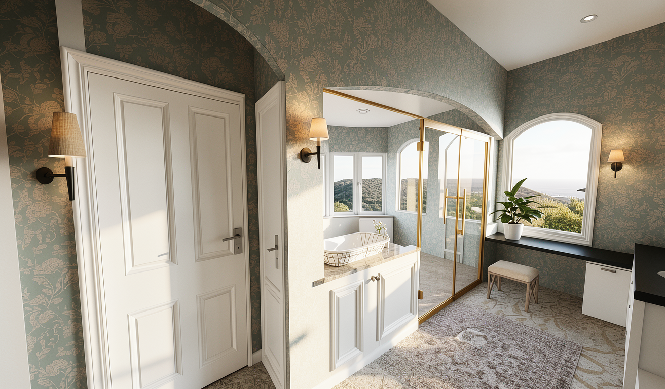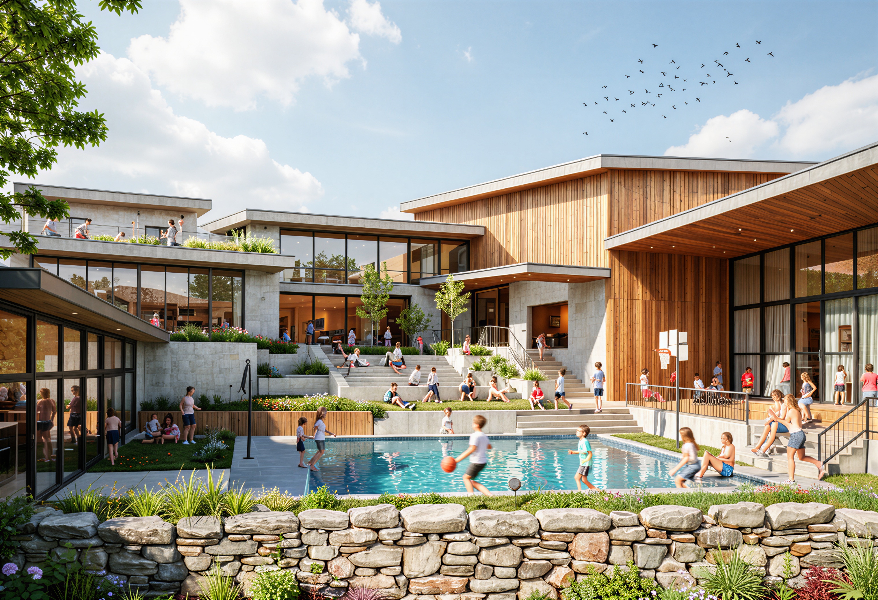 transform this image into a hand drawn architectural watercolor illustration use soft ink linework with slightly loose sketch like edges apply watercolor washes with a warm color palette light greens soft beiges sky blues introduce subtle paper texture and pigment variation with light bleeding and grain use diffuse natural daylight with soft shadows and a warm inviting glow simplify details while preserving overall composition and perspective render vegetation in an impressionistic airy style depict people as stylized lively figures with minimal facial detail and dynamic poses avoid photorealism emphasize an artistic conceptual presentation style often used in architectural competitions