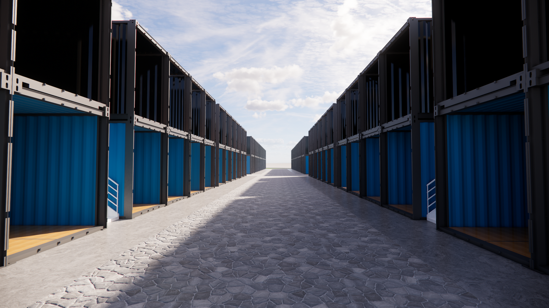 high tech exterior shot this are shipping containers top ones are houses bottom ones are shops make it realistic architecture