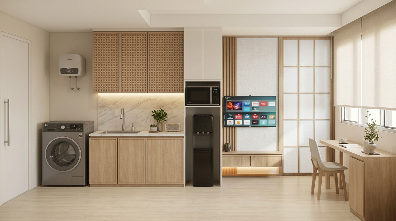the original image is the authoritative reference follow the drawing exactly preserve all wall positions and room proportions exactly no redesign no change of camera angle no layout modification no change on all geometry realistic materials soft global illumination warm ambient lighting led strip accent lighting sunlight entering from windows realistic shadows ambient occlusion highly detailed furniture clean architectural visualization ultra sharp render minimal background high contrast lighting dramatic shadows ray traced lighting photorealistic rendering ultra detailed textures render in natural daylight add apartment and greenery view from the window