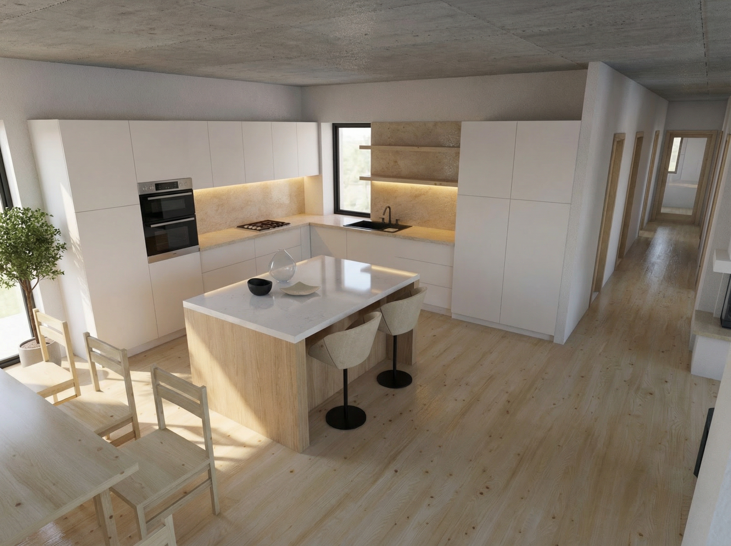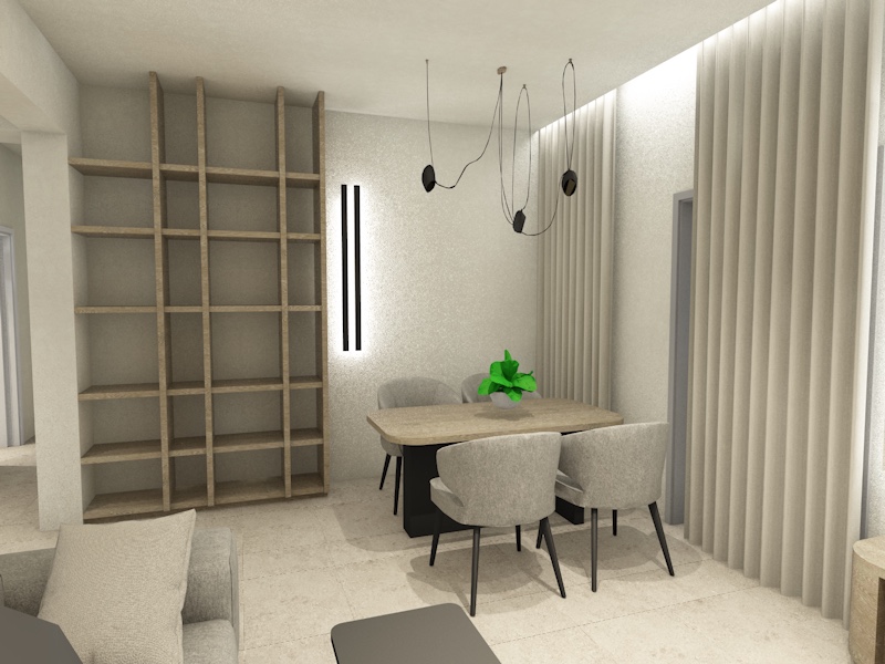 mannish modern environment use metallic black base for the dinning table grey matt tiles for the floor 60x120 add decor add a carpet add a painting on the wall keep the white wall color on the walls and a wooden top on the dinning table