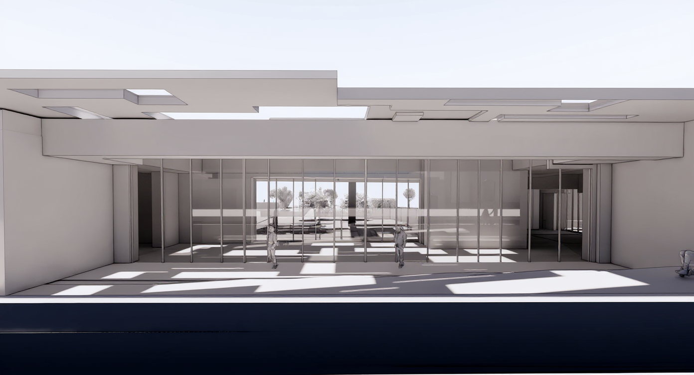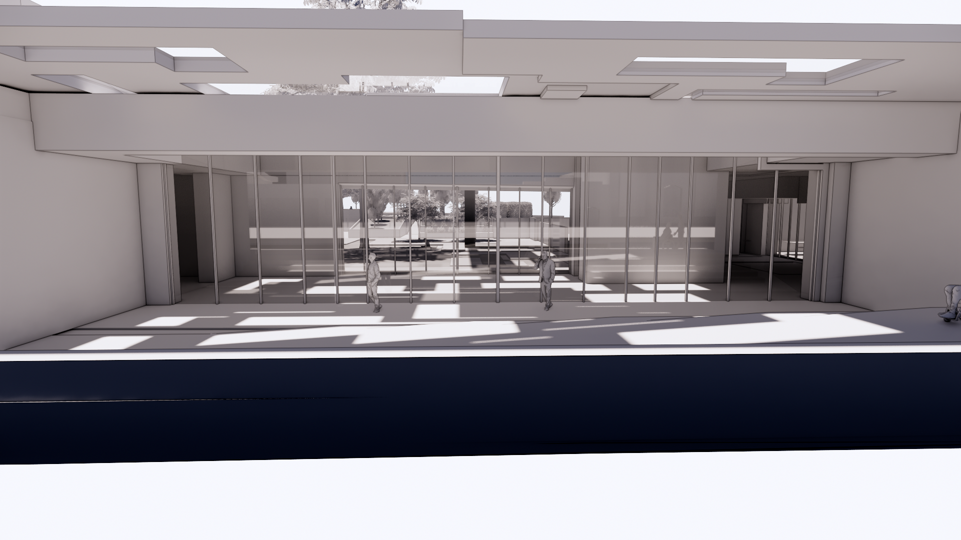 modernist exterior shot exterior view of a contemporary museum pavilion with a long horizontal fa ade clean white concrete and glass architecture large continuous glass curtain wall with slender vertical mullions deep overhanging roof with geometric cut out skylights casting sharp patterned shadows onto the ground minimalist open interior visible through the glass with museum furniture and silhouettes of people inside soft diffuse daylight calm atmosphere architectural rendering style no textures smooth clay model aesthetic with subtle shadows perspective centered on the fa ade wide angle architecture