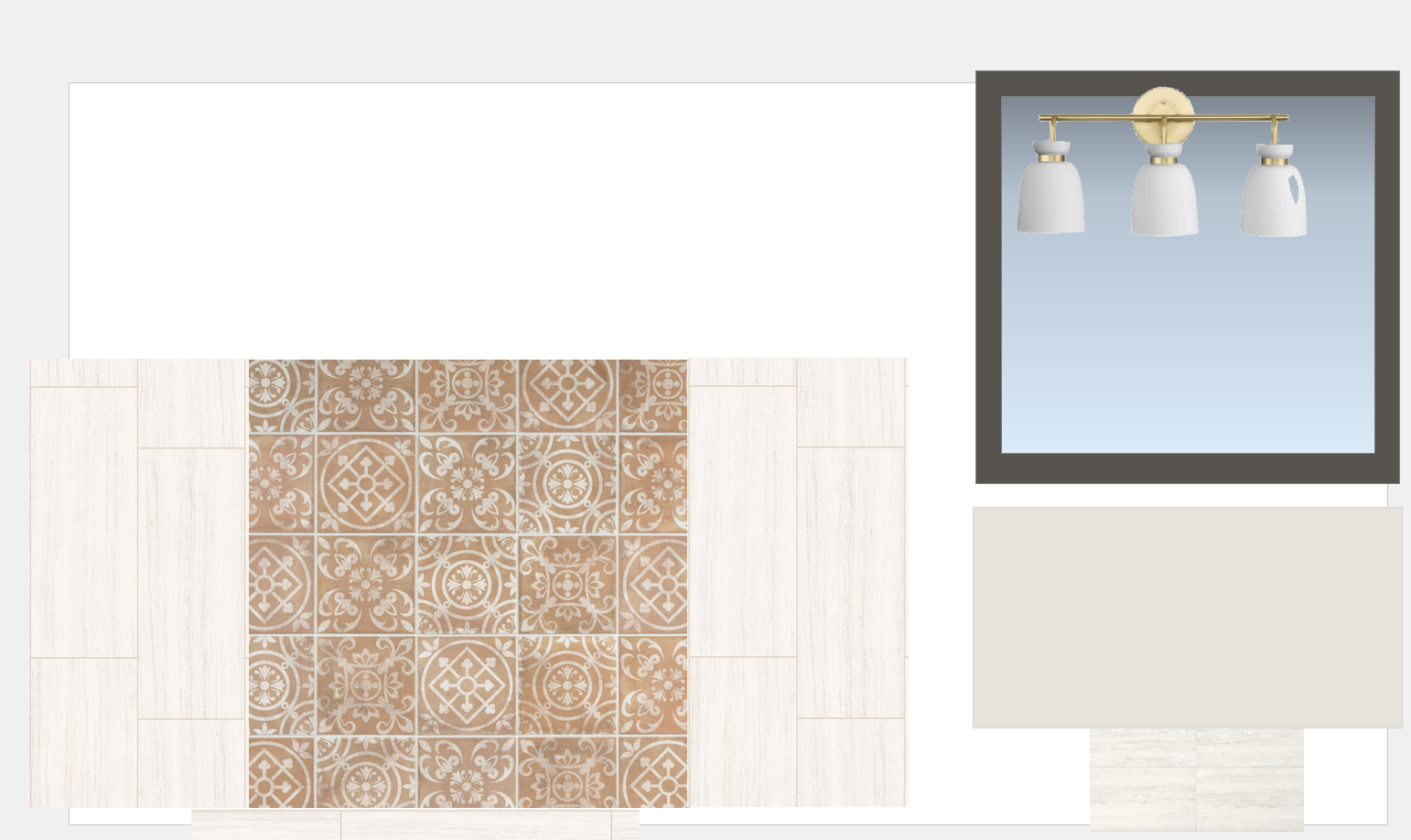 terracotta color tile is the main wall in the alcove style tub the beige tile goes on the floor and side walls of the tub alcove the large cream color is the vanity color add cabinet doors use brushed gold plumbing fixtures no windows put a toilet in the space this bathroom is not large the dark color is the mirror trim surround
