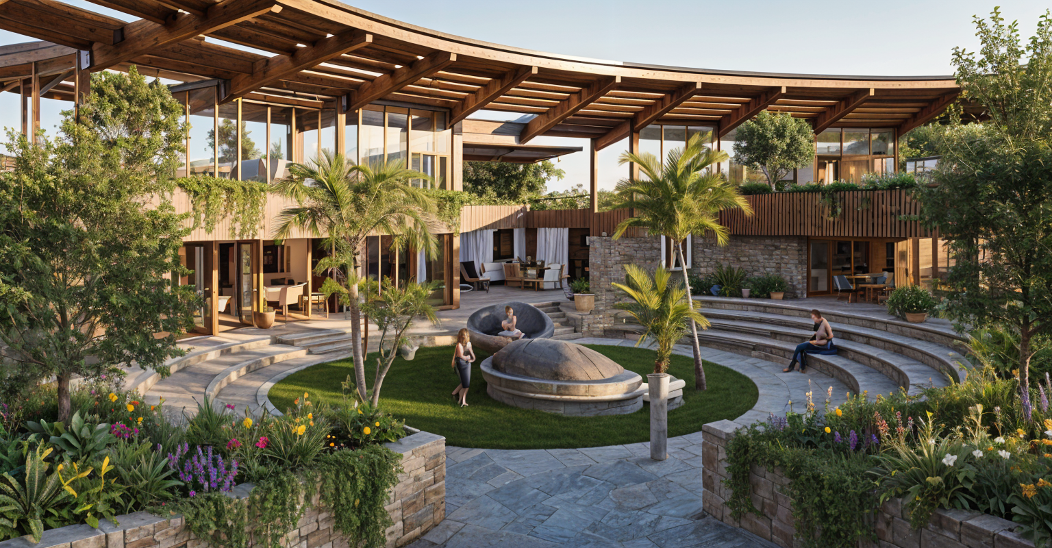 modernist rooftop shot use nature material wood stone concrete coziness and greenery set in the evening with soft gentle sunlight make it a community center make roofs curvy make the front area a green field architecture
