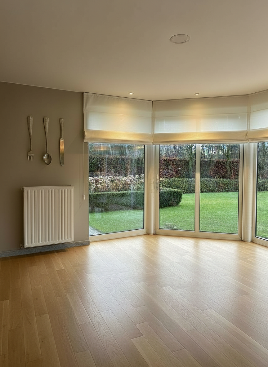 plaats de meubels in het moodboard in de ruimte de tafel komt in het midden van de veranda met 6 stoelen rond het dressoir is niet volledig zichtbaar omdat deze staat tegenover de ramen tegen de wand de pendel komt boven de tafel in het midden van de ruimte