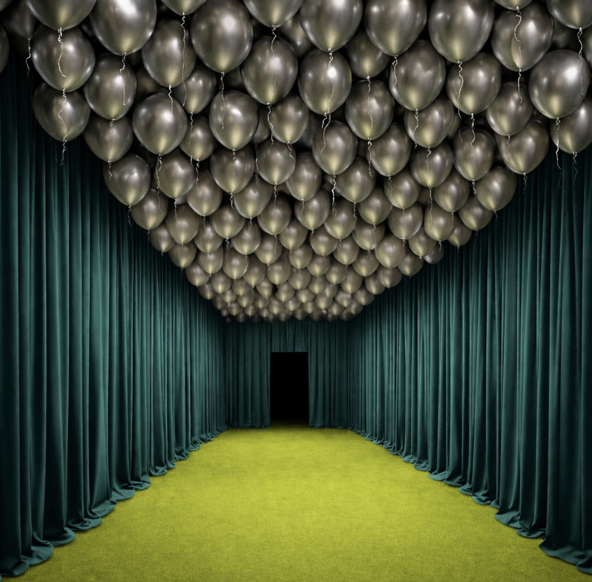 widen this hallway full ceiling of silver balloons carpet is yellow