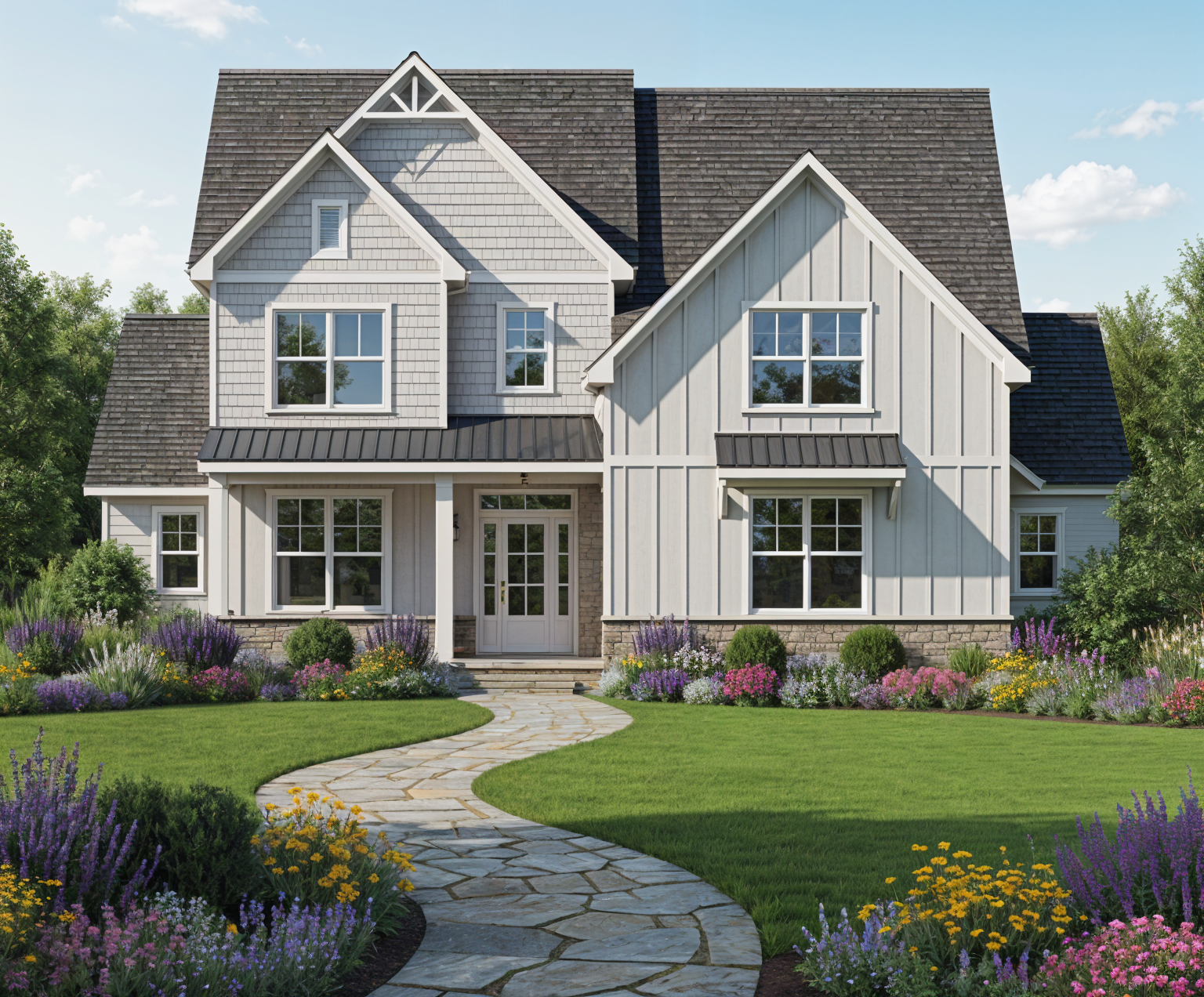 a manicured lawn layered flower beds low maintenance shrubs native plants stone pathway leading to the entrance please remove small first story wings off each side of the house and make the pathway straight