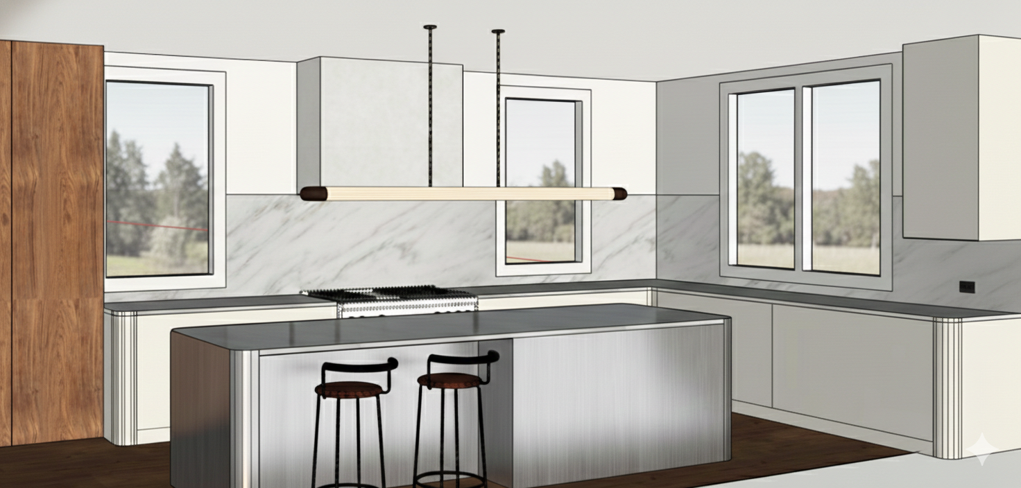 warmer lighting and matte metal finish on island
