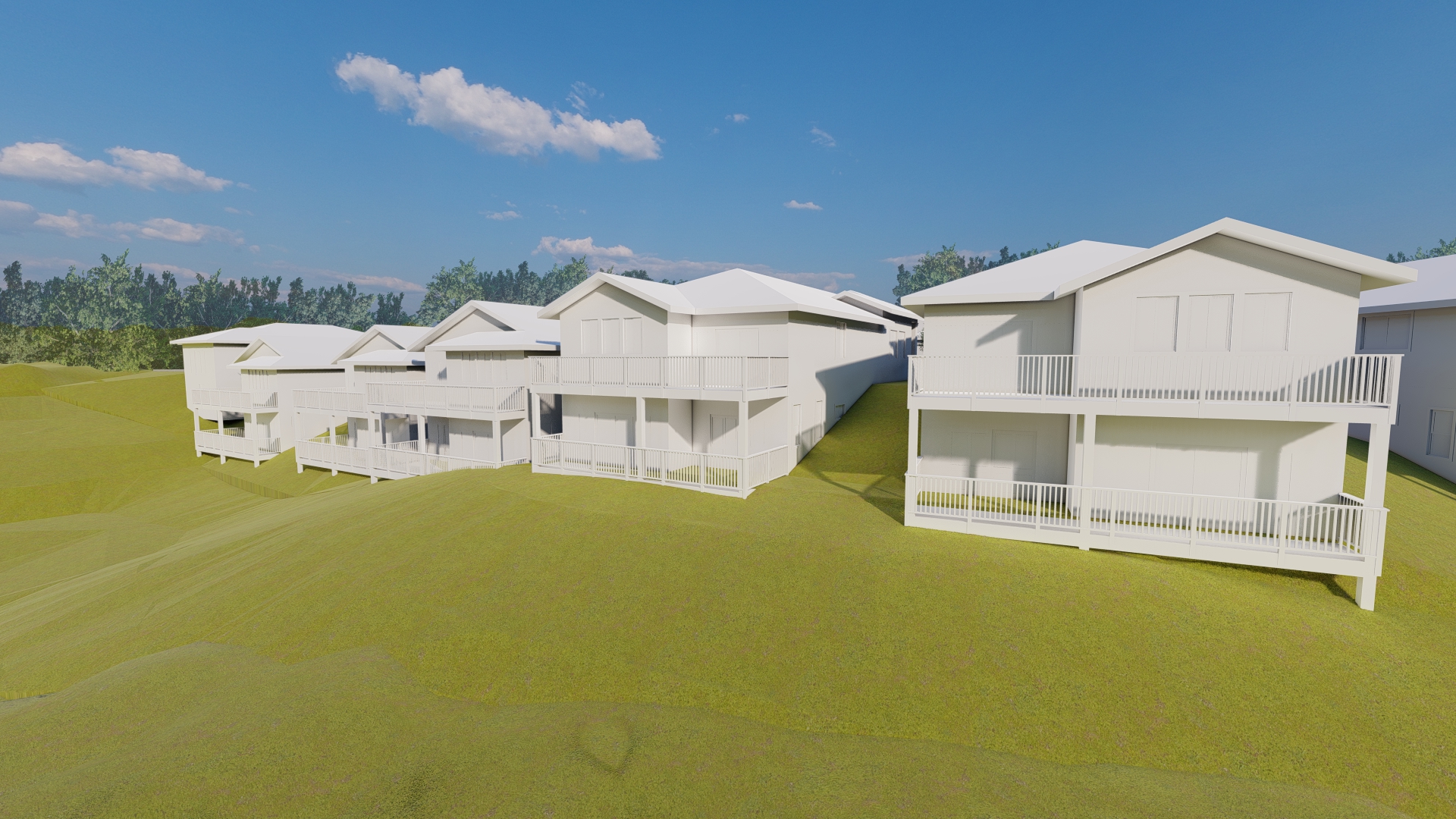 a row of modern houses on a gentle sloping hill surrounded by lush green grass and distant trees the houses have gray asphalt tile roof with prominent redwood balconies the walls are light earth toned stucco and each home has a different light earth tone there is 3 of stone at the lower levels on some of the homes the sky is a brilliant blue with soft white clouds scattered throughout sunlight casts warm natural shadows enhancing the serene and peaceful atmosphere the overall scene radiates tranquility and harmony with nature architecture