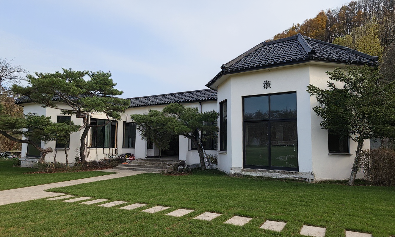 a serene rustic house nestled in an autumn forest the vintage brick building features a charming arched window the roof is a deep charcoal with classic tiles lush evergreen trees surround the structure their leaves in vibrant shades of green autumn foliage in the background displays a rich tapestry of orange yellow and brown the scene is bathed in soft gentle sunlight creating a warm and inviting atmosphere the sky above is a clear serene blue enhancing the overall tranquility