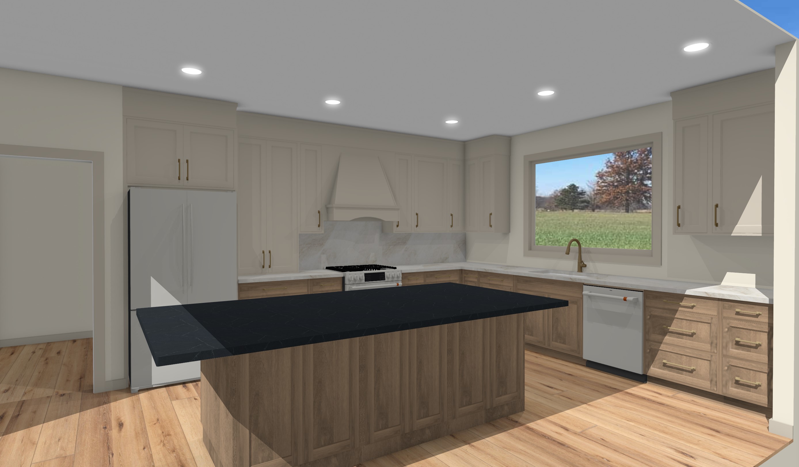 make this image a photograph of a kitchen make the trim around the window match the painted upper cabients in sherwin williams accessible beige