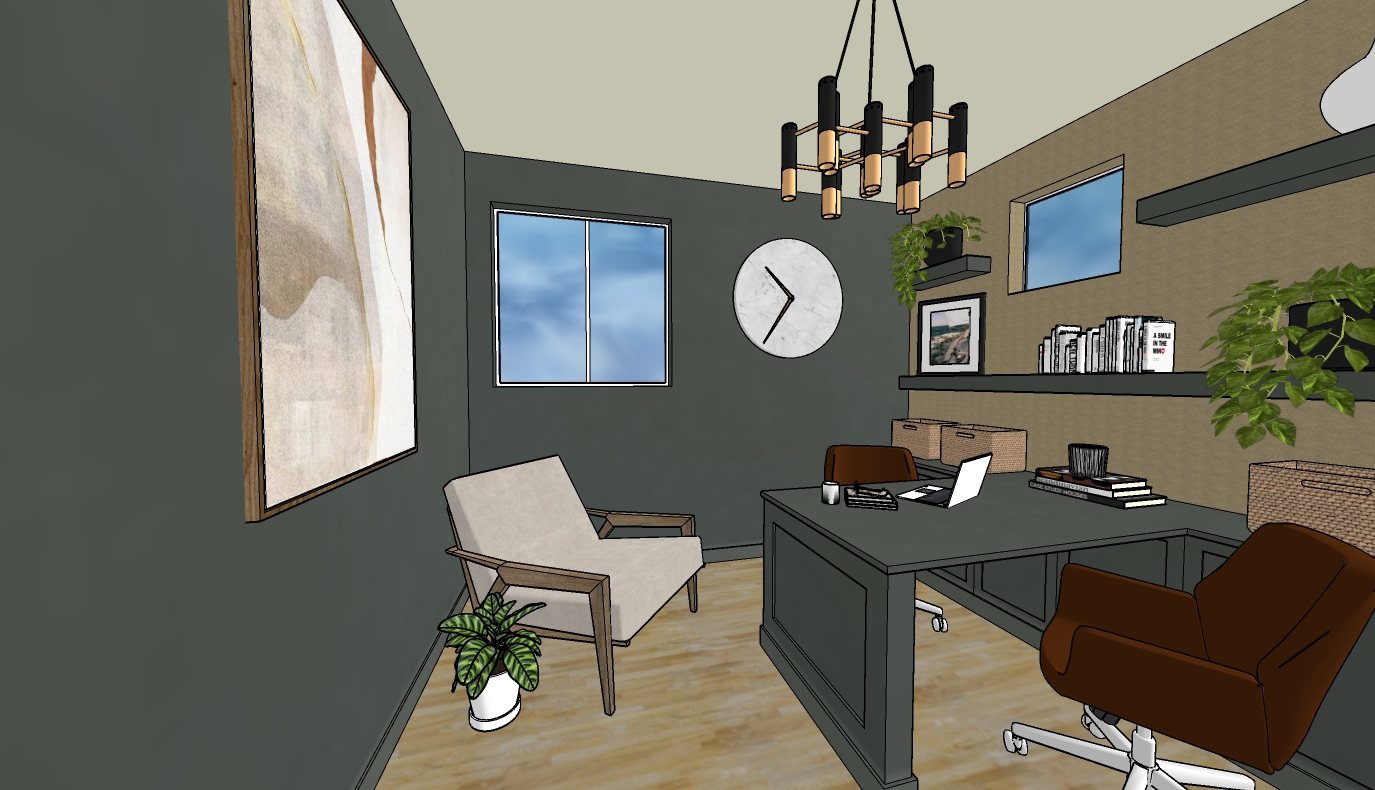 interior shot cozy office with wood plank floor textured grass cloth wall and shelves baskets on desk architecture