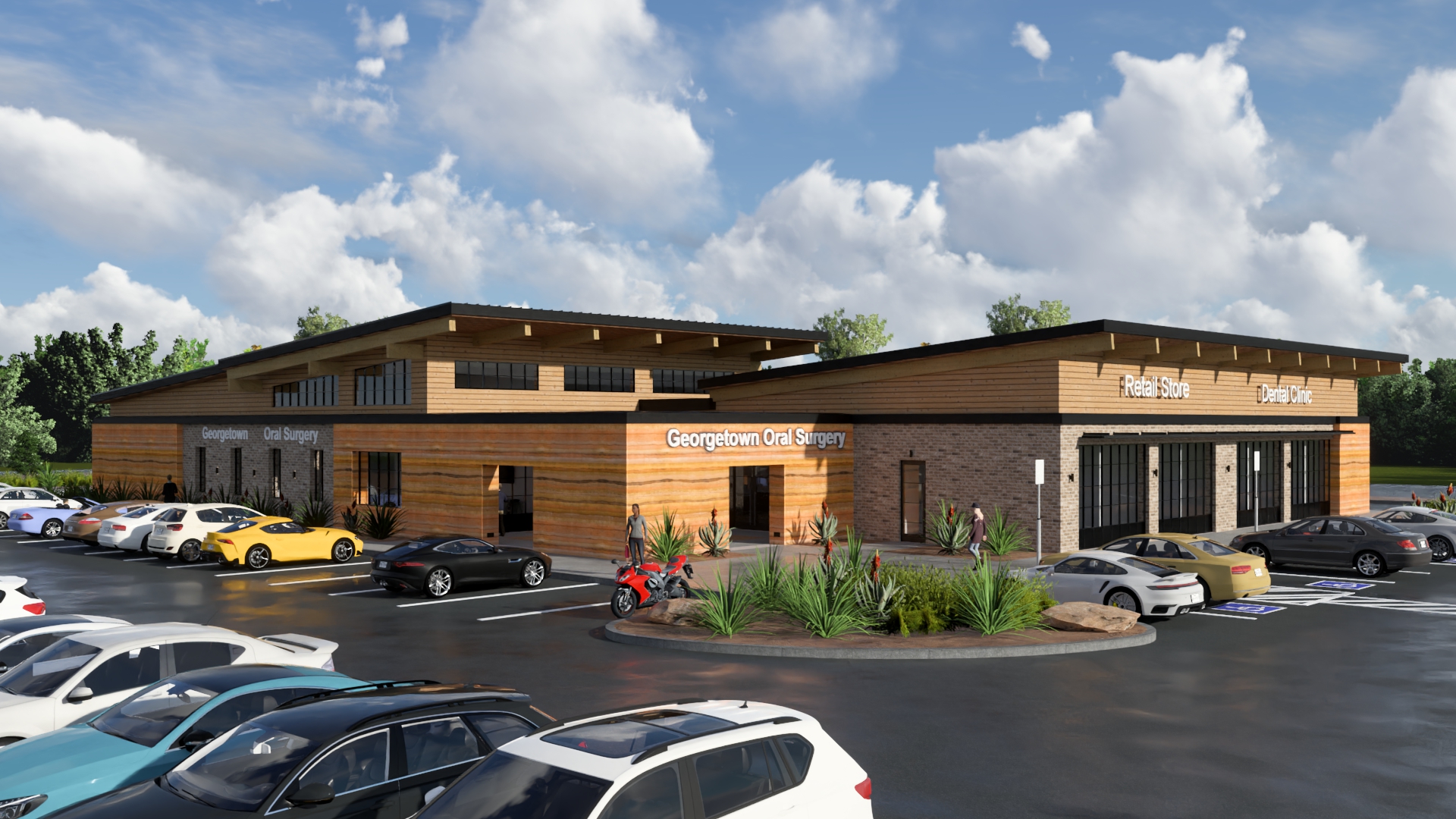 turn this into a twilight rendering keep building materials the same lighten up shadows and make details show add people and planting enhance realism